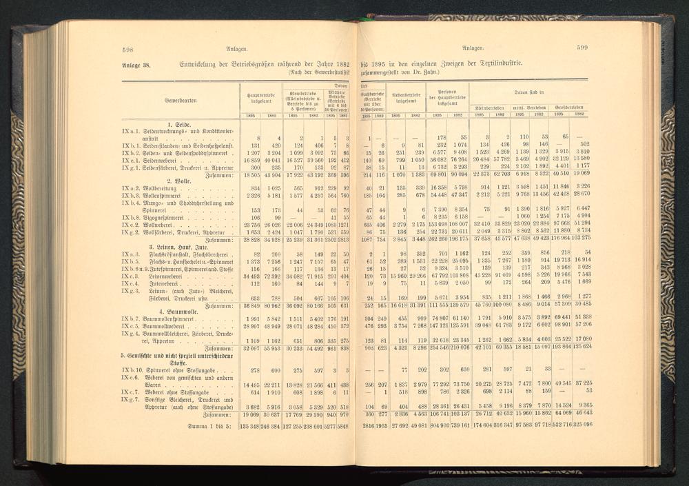 Anlage 38. Entwickelung der Betriebsgrößen während der Jahre 1882 bis 1895 in den einzelnen Zweigen der Textilindustrie.