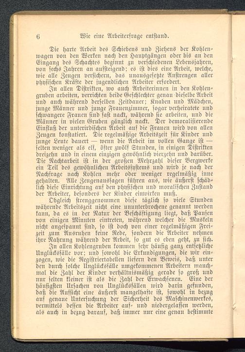 In allen Distrikten, wo auch Arbeiterinnen in den Kohlen-gruben arbeiten, verrichten beide Geschlechter genan dieselbe Arbeitund anch wahrend derselben Zeitdauer: Knaben und Mädchen,jnuge Männer und jnnge Frauenzimmer, sogar verheiratete undschwangere Frauen sind fast nackt, während sie arbeiten, und dieMäuucr in vielen Gruben gänzlich nackt. Der demoralisierendeEinfluß der unterirdischen Arbeit ans die Fraucu wird von allenZcngcn konstatiert. Die regelmäßige Arbeitszeit für Kinder undjnnge Leute dauert — wenn die Arbeit im vollcu Gange ist —selten weniger als elf, öfter zwölf Stunden, in einigen Distriktendreizehn und in einem einzigen gewöhnlich vierzehn uud darüber.Die Nachtarbeit ist in der großen Mehrzahl dieser Bergwerkeein Teil des gewöhnlichen Arbcitssystems nnd wird je nach derNachfrage nach Kohlen mehr oder weniger regelmäßig innegehalten. Alle Zeugenaussagen führen aus, wie äußerst schäd-lich diese Einrichtung ans den Physischen nnd moralischen Zustandder Arbeiter, besonders der Kinder einwirken mnß.