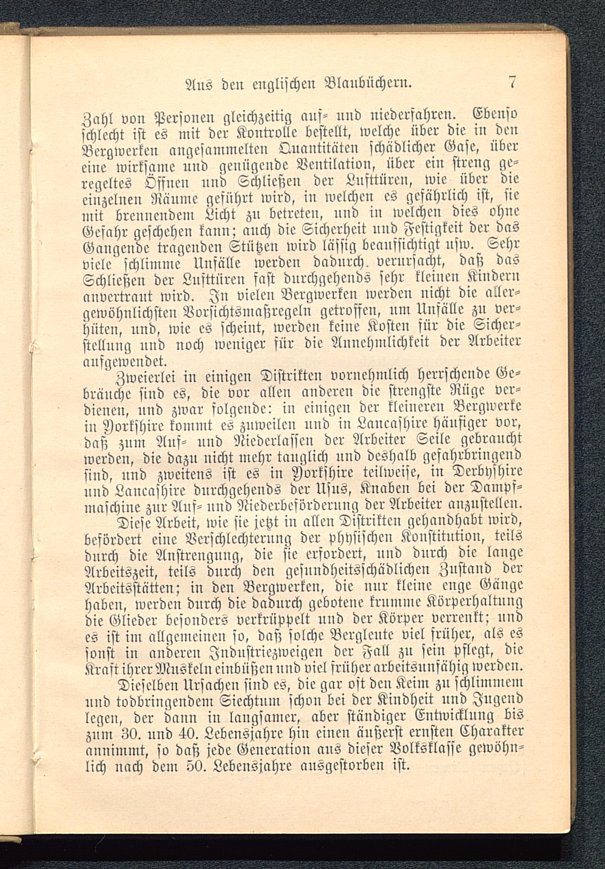 Diese Arbeit, wie sie jetzt in allen Distrikten gehandhabt wird,befördert eine Verschlechterung der physischen Konstitntion, teilsdurch die Anstrengung, die sie erfordert, nnd dnrch die langeArbeitszeit, teils dnrch den gcsnndhcitsschädlichcn Znstand derArbeitsstätten; in den Bergwerken, die nnr kleine enge Gängehaben, werden dnrch die dadurch gebotene krnmnic Körperhaltungdie Glieder besonders verkrüppelt nnd der Körper verrenkt: nndes ist im allgemeinen so, daß solche Bergleute viel früher, als essonst in anderen Industriezweigen der Fall zn sein Pflegt, dieKraft ihrer Mnskeln einbüßen nnd viel früher arbeitsunfähig werden.