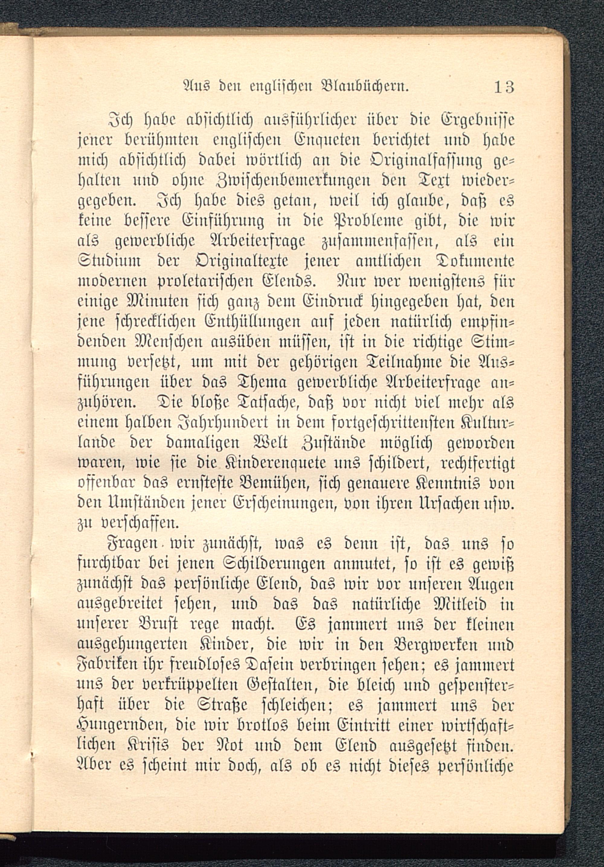 Fragen wir zunächst, was es denn ist, das uns sofurchtbar bei jenen Schilderungen anmutet, so ist es gewißzunächst das persönliche Elend, das wir vor unseren Augenausgebreitet sehen, nnd das das natürliche Mitleid inunserer Brust rege macht. Es jammert nns der kleinenausgehungerten Kinder, die wir in den Bergwerken undFabriken ihr freudloses Dasein verbringen sehen; es jammertuns der verkrüppelten Gestalten, die bleich nnd gespeustcr-haft über die Straße schleichen; es jammert uns derHungernden, die wir brotlos beim Eintritt einer wirtschaft-lichen Krisis der Not uud dem Elend ausgesetzt finden.Aber es scheint mir doch, als ob es nicht dieses persönliche