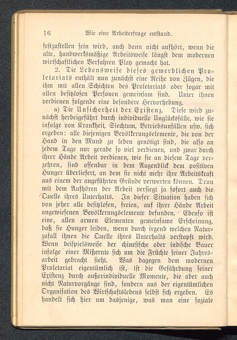 Die Unsicherheit der Existenz. Tiefe wird zu-nächst herbeigeführt durch individuelle Unglücksfttlle, wie sieinfolge von Krankheit, Siechtum, Betriebsunfällen usw. sichergeben: alle diejenigen Bcvölkeruugselemente, die von derHand in den Mund zu leben genötigt sind, die also anjedem Tage nur gerade so viel verdienen, und zwar durchihrer Hände Arbeit verdienen, wic sie an diesem Tage ver-zehren, sind offenbar in dem Augenblick dem positivenHunger überliefert, au dem sie nicht mehr ihre Arbeitskraftaus einem der angeführten Gründe verwerten können. Dennmit dem Aufhören der Arbeit versiegt ja sofort auch dieQuelle ihres Unterhalts. In dieser Situation haben sichvon jeher alle besitzlosen, freien, auf ihrer Hände Arbeitangewiesenen Bevölkcrungselemcntc befunden. Ebenso isteine, allen armen Elementen gemeinsame Erscheinung,daß sie Hunger leiden, wenn durch irgend welchen Natur-zufall ihueu die Quelle ihres Unterhalts verstopft wird.Wenn beispielsweise der chinesische oder indische Bauerinfolge einer Mißernte sich um die Früchte seiner Jahres-arbeit gebracht sieht. Was dagegen dem modernenProletariat eigentümlich ist, ist die Gefährdung seinerEristenz durch außerindividuelle Momente, die aber auchnicht Natnrvorgänge sind, sondern aus der eigeutümlicheuOrganisation des Wirtschaftslebens selbst sich ergeben. Eshandelt sich hier nm dasjenige, was man eine soziale