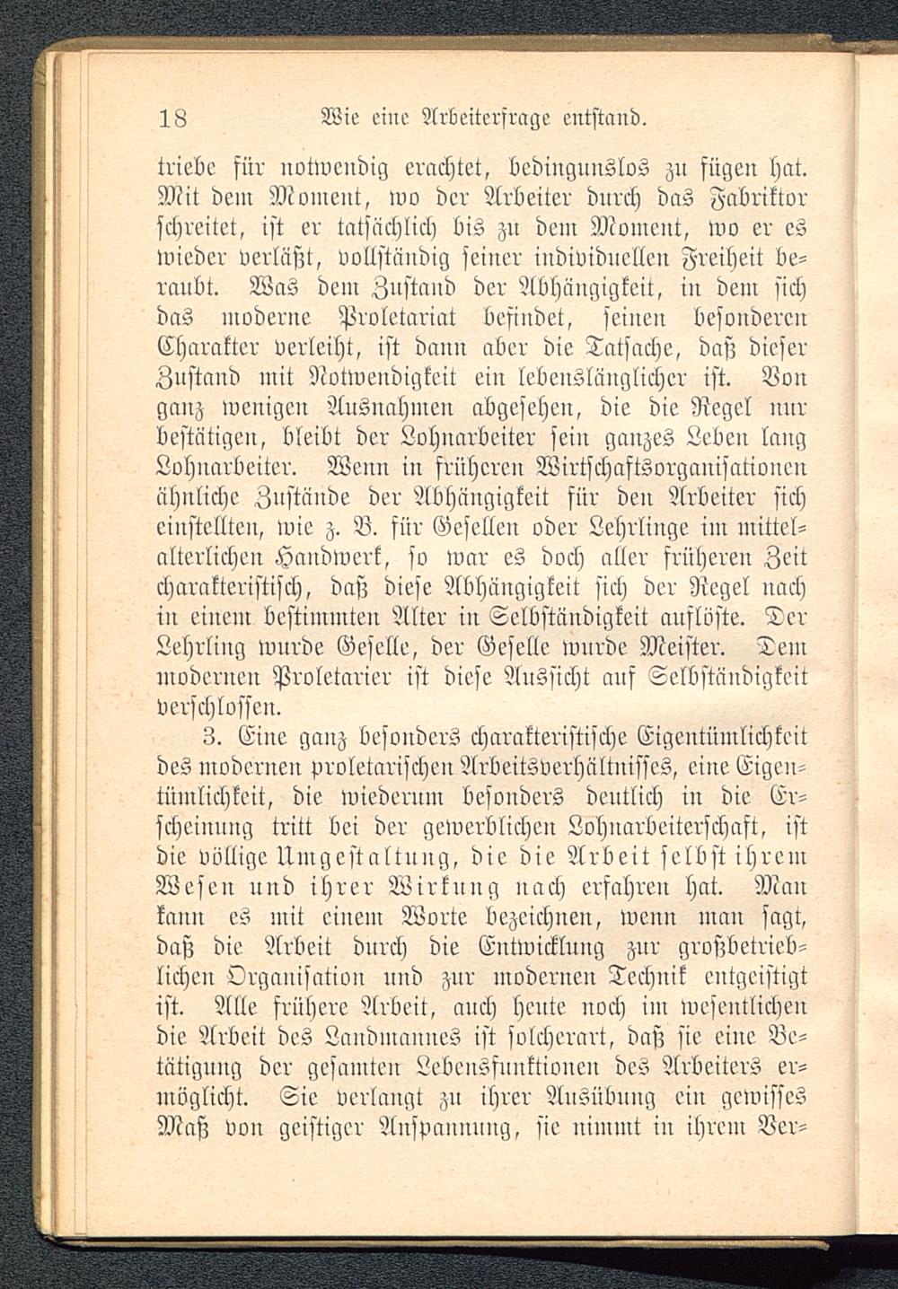 3. Eine ganz besonders charakteristische Eigentümlichkeitdes modernen proletarischen Arbeitsverhältnisscs, eine Eigen-tümlichkeit, die wiederum besonders deutlich in die Er-scheinung tritt bei der gewerblichen Lohnarbeiterschaft, istdie völlige Umgestaltung, die die Arbeit selbst ihremWesen und ihrer Wirkung nach erfahren hat. Mankann es mit einem Worte bezeichnen, wenn man sagt,daß die Arbeit durch die Entwicklung zur großbetrieb-licheu Organisation und zur modernen Technik entgeistigtist. Alle frühere Arbeit, auch heute noch im wesentlichendie Arbeit des Laudmaunes ist solcherart, daß sie eine Be-tütigung der gesamten Lebenssunktioncn des Arbeiters er-möglicht. Sie verlangt zu ihrer Ausübung ein gewissesMaß von geistiger Anspannung, sie nimmt in ihrem Ver-