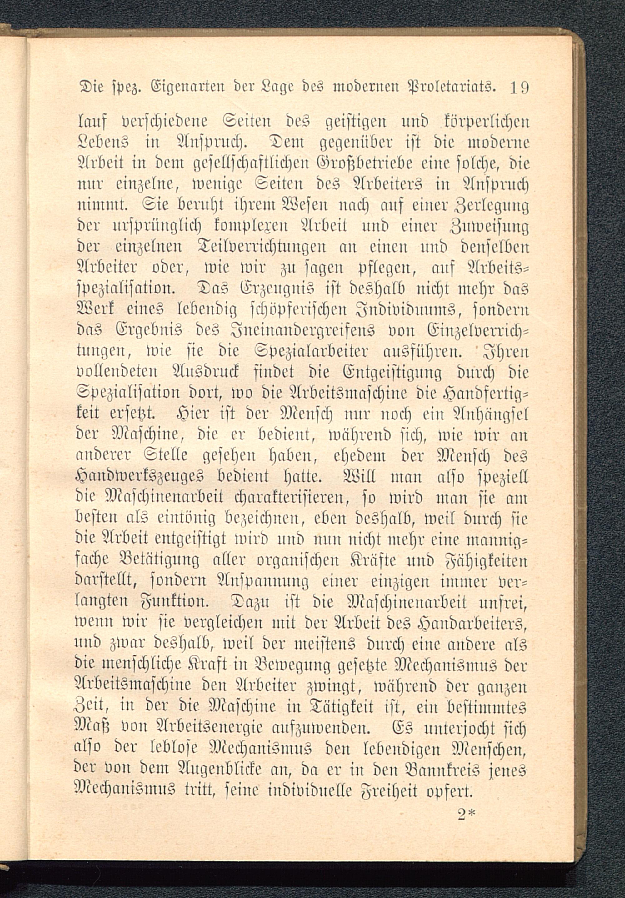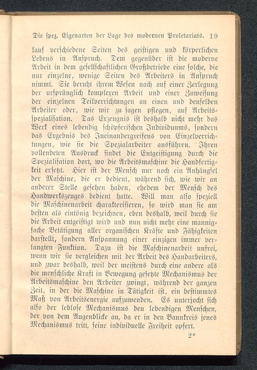 lauf verschiedene Seiten des geistigen nnd körperlichenLebens in Anspruch. Tem gegenüber ist die moderneArbeit in dem gesellschaftlichen Großbetriebe eine solche, dienur einzelne, wenige Seiten des Arbeiters iu Anspruchnimmt. Sie beruht ihrem Wesen nach auf einer Zerlegungder ursprünglich kompleren Arbeit und einer Zuweisungder einzelnen Teilvcrrichtnngen an einen und denselbenArbeiter oder, wie wir zu sagen pflegen, auf Arbeits-spezialisation. Tas Erzenguis ist deshalb nicht mehr dasWerk eiues lebendig schöpferischen Individuums, sonderndas Ergebnis des JncinandergreifcnS von Einzclverrich-tnugcu, wie sie die Spezialarbeiter ausführen. 'Ihrenvolleudeten Ausdruck findet die Entgeistignng durch dieSpezinlisation dort, wo die Arbeitsmaschine die Handfertig-keit ersetzt. Hier ist der Mensch nnr noch ein Anhängselder Maschine, die er bedient, während sich, wie wir ananderer Stelle gesehen haben, ehedem der Mensch desHandwerkszeuges bedient hatte. Will man also spezielldie Maschinenarbeit charakterisieren, so wird man sie ambesten als eintönig bezeichnen, eben deshalb, weil durch 'iedie Arbeit entgeistigt wird und nun nicht mehr eine mannig-fache Betätigung aller organischen Kräfte und Zähigkeitendarstellt, sondern Anspannung einer einzigen immer ver-langten Funktion. Tazn ist die Maschinenarbeit unfrei,wenn wir sie vergleichen mit der Arbeit des Handarbeiters,und zwar deshalb, weil der meistens durch eine andere alsdie menschliche Kraft in Bewegung gesetzte Mechanismus derArbcitSmaschine den Arbeiter zwingt, während der ganzenZeit, in der die Maschine in Tätigkeit ist, ei» bestimmtesMaß von Arbcitsenergic aufzuwenden. Es unterjocht sichalso der leblose Mechanismus den lebendigen Menschen,der von dem Augenblicke an, da er in den Bannkreis jenesMechanismus tritt, seine individuelle Freiheit opfert.