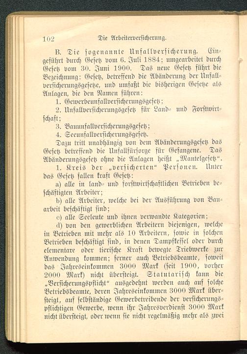 75. Tic sogenannte Unfallversicherung. Ein-geführt dnrch Gesetz vom 6. Juli 1884; umgearbeitet dnrchGesetz vom 30. Juni 1900. Das neue Gesetz führt dieBezeichnung! Gesetz, betreffend die Abänderung der Unfall-versicherungsgesctze, und umfaßt die bisherigen Gesetze alsAnlagen, die den Namen führen i