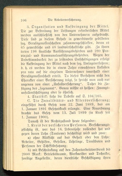 <ü. Die Juvaliditäts- und Altersversicherung;eingeführt durch Gesetz vom 22. Juni 1889, das am1. Januar 1891 Gesetzeskraft erlangte. Eine Neuordnungbrachte das Gesetz vom 13. Juli 1899 (in Kraft seit1. Januar 1900).