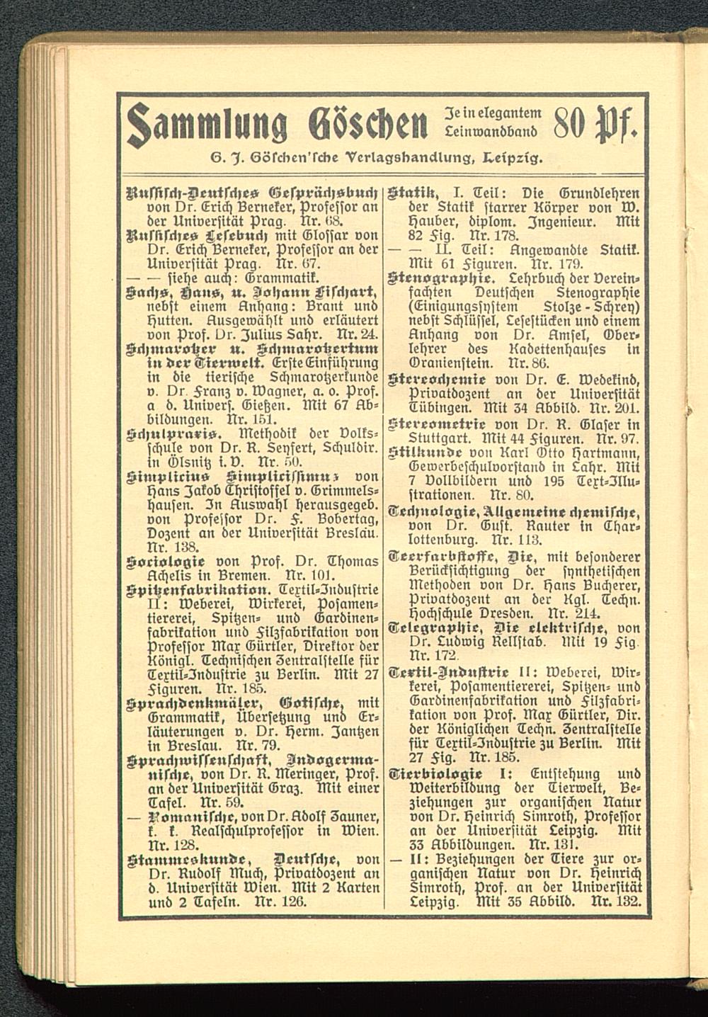 Tirrbiologir I: Entstehung undWeiterbildung der Tierwelt, Be-ziehungen zur organischen Naturvon Dr. Heinrich Simroth , Professoran der Universität Leipzig . MitZZ Abbildungen. Nr. 131.