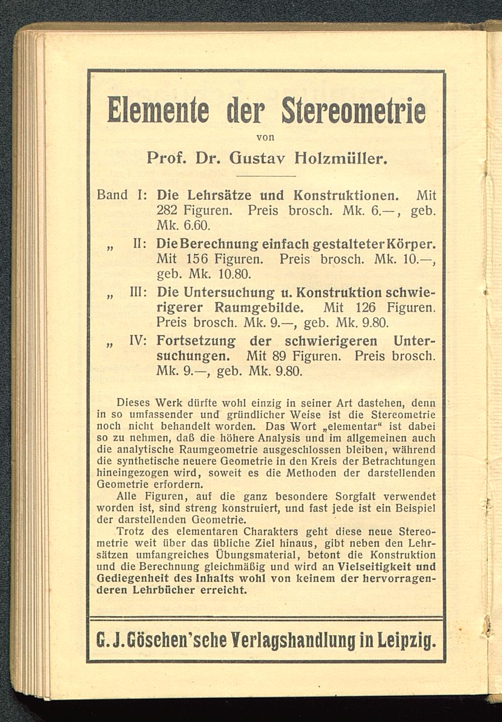 I^rot^ äes elementaren Lliarskters gelit diese neue Stereo-metris v/eit über äss llbliclie ?iel binsus, gibt neben clen I^ebr-säken umiangreiclies t)bungsmgterizl, betont clie Konstruktionunä äie IZerecnnung gleickmÄlZig unä vvirä sn Vielseitigkeit un^(Zeäiegenkeit äes Inbalts von! von keinem äer kervorrsgen-äeren l-erirbüctier erreiclit.