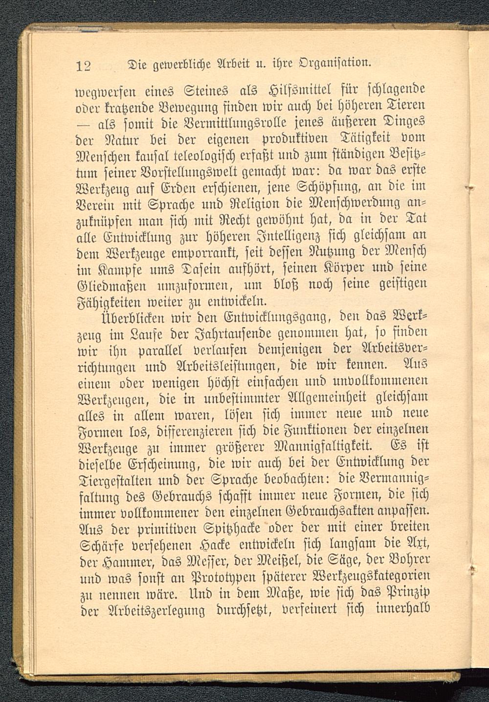 wegwerfen eines Steines als Hilfsmittel für schlagendeoder kratzende Bewegung finden wir auch bei höheren Tieren— als somit die Vermittlungsrolle jenes äußeren Dingesder Natur bei der eigenen produktiven Tätigkeit vomMenschen kausal teleologisch erfaßt und zum ständigen Besitz-tum seiner Vorstelluugswelt gemacht war: da war das ersteWerkzeug auf Erden erschienen, jene Schöpfung, an die imVerein mit Sprache und Religion die Menschwerdung an-zuknüpfen man sich mit Recht gewöhnt hat, da in der Tatalle Entwicklung zur höhereu Intelligenz sich gleichsam andem Werkzeuge emporrankt, seit dessen Nutzung der Menschim Kampfe ums Dasein aufhört, seinen Körper und seineGliedmaßen umzuformen, um bloß noch seine geistigenFähigkeiten weiter zu entwickeln.