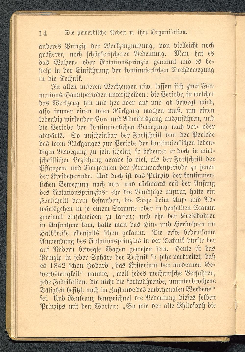 In allen unseren Werkzeugen nsw. lassen sich zwei For-mations-Hauptpcriodcu unterscheiden: die Periode, in welcherdas Werkzeug hin und her oder auf und ab bewegt wird,also immer einen toten Rückgang machen muß, um einenlebendig wirkenden Vor- und Abwärtsgang auszuführen, unddie Periode der kontinuierlichen Bewegung nach vor- oderabwärts. So unscheinbar der Fortschritt von der Periodedes toten Rückganges zur Periode der koutinuicrlichcu leben-digen Bewegung zu sein scheint, so bedeutet er doch in wirt-schaftlicher Beziehung gerade so viel, als der Fortschritt derPflanzen- und Tierfornien der Grauwackeuperiodc zu jenender Kreideperiode. Und doch ist das Prinzip der kontinuier-lichen Bewegung uach vor- uud rückwärts erst der Anfangdes Notationsprinzips: ehe die Bandsäge auftrat, hatte einFortschritt darin bestanden, die Säge beim Ans- und Ab-wärtsgehen in je einem Stamme oder in denselben Stammzweimal einschneideu zu lasseu; und ehe der Kreisbohrerin Aufnahme kam, hatte man das Hin- und Herbohren imHalbkreise ebenfalls schon gekannt. Die erste bedeutsameAnwendung des Rotationsprinzips in der Technik dürfte deraus Rädern bewegte Wagen gewesen sein. Heute ist dasPrinzip in jeder Sphäre der Technik so sehr verbreitet, daßes 1842 schon Jobard „das Kriterium der modernen Ge-werbstätigkeit" nannte, „weil jedes mechanische Verfahren,jede Fabrikation, die nicht die fortwährende, uunnterbrocheneTätigkeit besitzt, noch im Znstande des embryonalen Werdens"sei. Und Renleaux kennzeichnet die Bedeutung dieses selbenPrinzips mit den,Worten: „So wie der alte Philosoph die