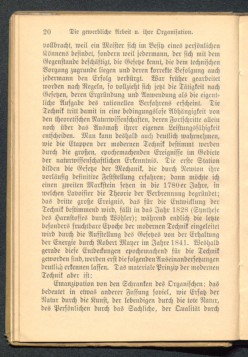 vollbracht, weil ein Meister sich im Besitz eines persönlicheilKönnens befindet, sondern weil jedermann, der sich mit demGegenstände beschäftigt, die Gesetze kennt, die dem technischenVorgang zugrunde liegen und deren korrekte Befolgnng anchjedermann deu Erfolg verbürgt. War früher gearbeitetworden nach Regeln, so vollzieht sich jetzt die Tätigkeit nachGesetzen, deren Ergrüuduug und Anwendung als die eigent-liche Aufgabe des rationellen Verfahrens erscheint. DieTechnik tritt damit iu eine bedingungslose Abhängigkeit vonden theoretischen Naturwissenschaften, deren Fortschritte alleinnoch über das Ausmaß ihrer eigenen Leistungsfähigkeitentscheiden. Mau kauu deshalb auch deutlich wahrnehmen,wie die Etappen der modernen Technik bestimmt werdendurch die großen, epochemachenden Ereignisse im Gebieteder naturwissenschaftlichen Erkenntnis. Die erste Stationbilden die Gesetze der Mechanik, die durch Newton ihrevorläufig definitive Feststelluug erfahren; dann möchte icheinen zweiten Markstein setzen in die 1780 er Jahre, inwelchen Lavoisier die Theorie der Verbrennung begründet;das dritte große Ereignis, das für die Entwicklung derTechnik bestimmend wird, füllt in das Jahr 1828 (Synthesedes Harnstoffes durch Wähler); während endlich die letztebesonders fruchtbare Epoche der modernen Technik eingeleitetwird durch die Aufstellung des Gesetzes von der Erhaltungder Energie dnrch Robert Mayer im Jahre 1841. Weshalbgerade diese Entdeckungen epochemachend für die Technikgeworden sind, werden erst die folgendenAnscinandersetznugcndeutlich erkennen lassen. Tas matcriale Prinzip der modernenTechnik aber ist: