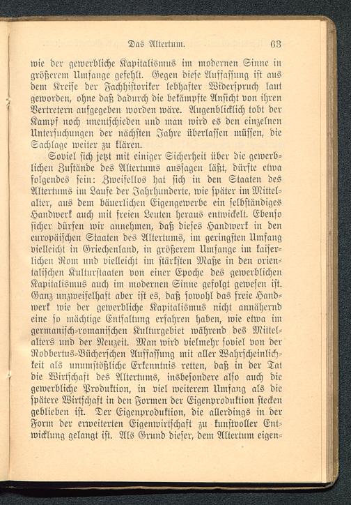 Soviel sich jetzt mit einiger Sicherheit über die gewerb-lichen Zustände des Altertums aussagen läßt, dürfte etwafolgendes sein: Zweifellos hat sich in den Staaten desAltertums im Laufe der Jahrhunderte, wie später im Mittel-alter, aus dem bäuerlichen Cigengewcrbc ein selbständigesHandwerk auch mit freien Leuten heraus entwickelt. Ebensosicher dürfen wir annehmen, daß dieses Handwerk in deneuropäischen Staaten des Altertums, im geringsten Umfangvielleicht in Griechenland , in größerem Umfange im kaiser-lichen Rom und vielleicht im stärksten Maße in den orien-talischen Kulturstaaten von einer Epoche des gewerblichenKapitalismus auch im modernen Sinne gefolgt gewesen ist.Ganz unzweifelhaft aber ist es, daß sowohl das freie Hand-werk wie der gewerbliche Kapitalismus nicht annäherndeine so mächtige Entfaltung erfahren haben, wie etwa imgermauisch-romanischen Kulturgebiet während des Mittel-alters und der Neuzeit. Man wird vielmehr soviel von derNodbertus-Bücherschen Auffassung mit aller Wahrscheinlich-keit als unumstößliche Erkenntnis retten, daß in der Tatdie Wirtschaft des Altertums, insbesondere also auch diegewerbliche Produktion, in viel weiterem Umfang als diespätere Wirtschaft in den Formen der Eigenproduktion steckengeblieben ist. Der Eigenproduktion, die allerdings in derForm der erweiterten Eigenwirtschaft zu kunstvoller Ent-wicklung gelangt ist. Als Grund dieser, dem Altertum eigen-