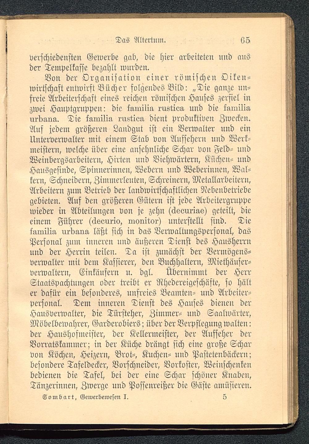 Von der Organisation einer römischen Oiken-wirtschaft entwirft Bücher folgendes Bild: „Die ganze un-freie Arbeiterschaft eines reichen römischen Hanfes zerfiel inzwei Hauptgruppein die isuruiia rustioa und die lamilia,urdana. Die lamilia. rustioa dient Produktiven Zwecken.Auf jedem größeren Landgut ist ein Verwalter und einUnterverwalter mit einem Stab von Aufsehern und Werk-meistern, welche über eine ansehnliche Schar von Feld- undWeinbergsarbeitern, Hirten und Viehwärtern, Küchen- undHausgesinde, Spinnerinnen, Webern und Weberinnen, Wal-kern, Schneidern, Zimmerleuten, Schreinern, Metallarbeitern,Arbeitern zum Betrieb der landwirtschaftlichen Nebenbetriebegebieten. Auf den größeren Gütern ist jede Arbeitergruppcwieder in Abteilungen von je zehn (äsouria-s) geteilt, dieeinem Führer (clsourlo, Monitor) unterstellt sind. Dieikiitilia, urdaira, läßt sich in das Berwaltungspersonal, dasPersonal zum inneren und äußeren Dienst des Hausherrnund der Herrin teilen. Da ist zunächst der Vermögens-verwalter mit dem Kassierer, den Buchhaltern, Miethäuser-verwaltern, Einkäufern u. dgl. Übernimmt der HerrStaatspachtungen oder treibt er Rhedereigeschäfte, so hälter dafür ein besonderes, unfreies Beamten- und Arbeiter-personal. Dem inneren Dienst des Hauses dienen derHausverwalter, die Türsteher, Zimmer- und Saalwärter,Möbelbewahrer, Garderobiers; über der Verpflegung walten ider Haushofmeister, der Kellermeister, der Aufseher derVorratskammer; in der Küche drängt sich eine große Scharvon Köchen, Heizern, Brot-, Knchen- und Pastetenbäckcru -besondere Tafeldecker, Vorschneidcr, Vorkoster, Weinschenkenbedienen die Tafel, bei der eine Schar schöner Knaben,Tänzerinnen, Zwerge und Possenreißer die Gäste amüsieren.