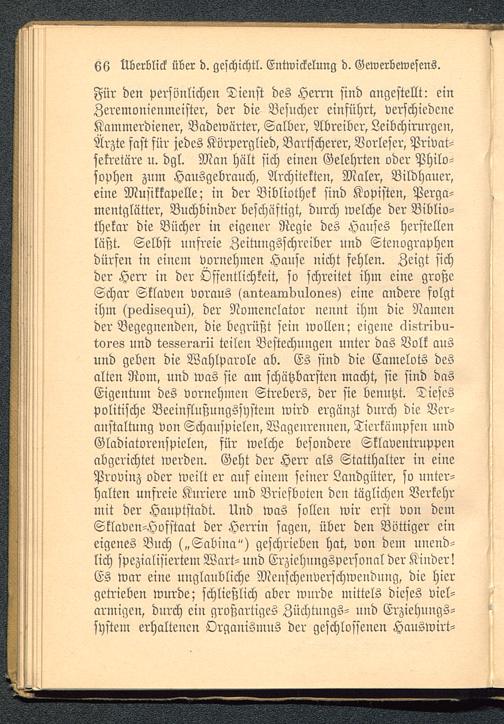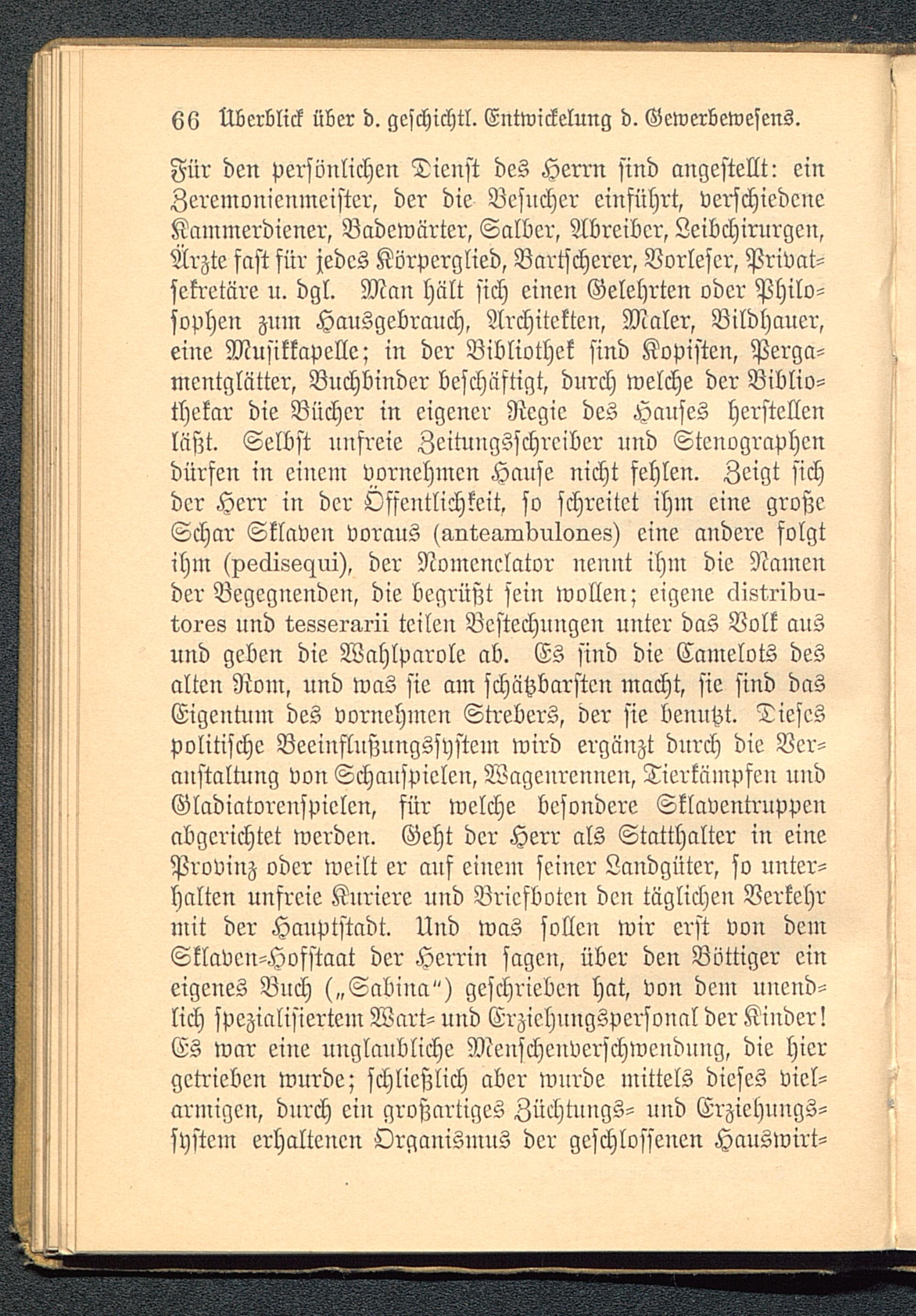 Für den persönlichen Dienst des Herrn sind angestellt: einZeremomcnmcister, der die Besucher einführt, verschiedeneKammerdiener, Badcwärter, Salber, Abreibcr, Leibchirurgcn,Ärzte fast für jedes Körperglied, Bartscherer, Vorleser, Privat-sekretäre u. dgl. Man hält sich einen Gelehrten oder Philo-sophen zum Hausgebrauch, Architekten, Maler, Bildhauer,eine Musikkapelle; in der Bibliothek sind Kopisten, Perga-mentglätter, Buchbinder beschäftigt, durch welche der Biblio-thekar die Bücher in eigener Regie des Hauses herstellenläßt. Selbst unfreie Zeitungsschreiber und Stenographendürfen in einem bornehmen Hause nicht fehlen. Zeigt sichder Herr in der Öffentlichkeit, so schreitet ihm eine großeSchar Sklaven voraus (antsainbuloirss) eine andere folgtihm (psäi8khui), der Nomcmlator nennt ihm die Namender Begegnenden, die begrüßt sein wollen; eigene clistridu-tores und tssserarii teilen Bestechungen unter das Volk ausund geben die Wahlparole ab. Es sind die Camelots desalten Rom, und was sie am schätzbarsten macht, sie sind dasEigentum des vornehmen Strebers, der sie benutzt. Tiefespolitische Becinflußungssystem wird ergänzt durch die Ver-anstaltung von Schauspielen, Wagenrennen, Tierkämpfen undGladiatorenspielen, für welche besondere Sklaventruppeuabgerichtet werden. Geht der Herr als Statthalter in eineProvinz oder weilt er auf einem seiner Landgüter, so unter-halten unfreie Kuriere und Bricfbotcn den täglichen Verkehrmit der Hauptstadt. Und was sollen wir erst von demSklaven-Hofstaat der Her-rin sagen, über den Böttiger eineigenes Buch („Sabina") geschrieben hat, von dem unend-lich spezialisierten! Wart- uud Erziehungsvcrsonal der Kinder!Es war eine unglaubliche Menschenverschwendung, die hiergetrieben wurde; schließlich aber wurde mittels dieses viel-armigen, durch eiu großartiges Züchtungs- und Erziehungs-systcm erhaltenen Organismus der geschlossenen Hauswirt-