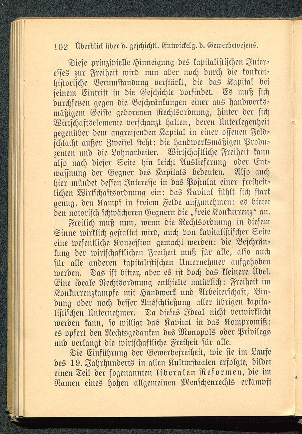 Die Einführung der Gewerbefreiheit, wie sie im Laufedes 19. Jahrhunderts in allen Kulturstaaten erfolgte, bildeteinen Teil der sogenannten liberalen Reformen, die imNamen eines hohen allgemeinen Menschenrechts erkämpft
