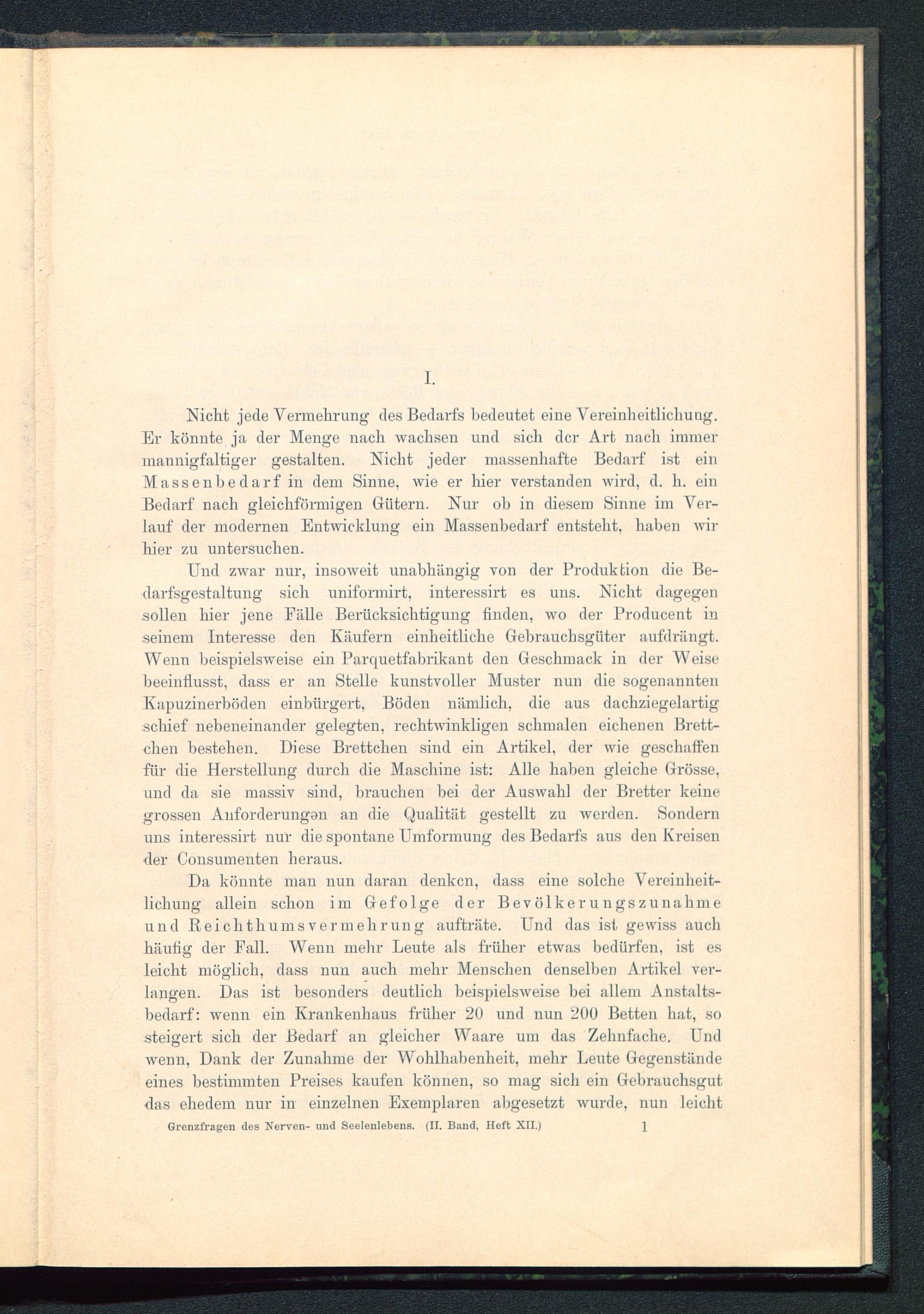 Da könnte man nun daran denken, dass eine solche Vereinheit-lichung allein schon im Gefolge der Bevölkerungszunähmeund ReiclithumsVermehrung aufträte. Und das ist gewiss auchhäufig der Fall. Wenn mehr Leute als früher etwas bedürfen, ist esleicht möglich, dass nun auch mehr Menschen denselben Artikel ver-langen. Das ist besonders deutlich beispielsweise bei allem Anstalts-bedarf: wenn ein Krankenhaus früher 20 und nun 200 Betten hat, sosteigert sich der Bedarf an gleicher Waare um das Zehnfache. Undwenn, Dank der Zunahme der Wohlhabenheit, mehr Leute Gegenständeeines bestimmten Preises kaufen können, so mag sich ein Gebrauchsgutdas ehedem nur in einzelnen Exemplaren abgesetzt wurde, nun leicht