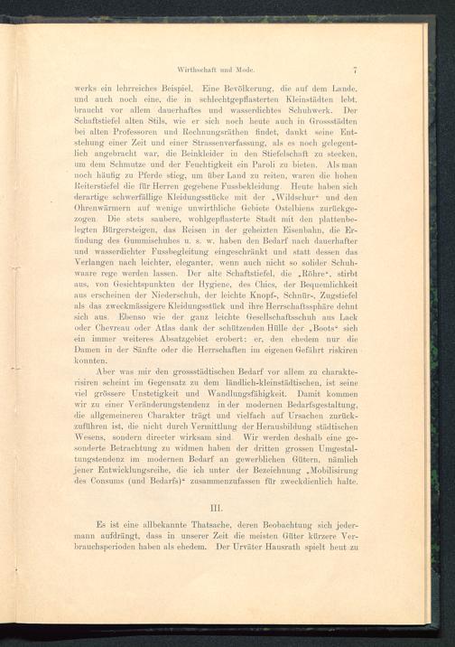 werks ein lehrreiches Beispiel. Eine Bevölkerung, die auf dem Lunde,und auch noch eine, die in schlechtgepflasterten Kleinstädten lebt,braucht vor allem dauerhaftes und wasserdichtes Schuhwerk. DerSchaftstiefel alten Stils, wie er sich noch heute auch in Gressstädtenbei alten Professoren und Bechnungsrüthen findet, dankt seine Ent-stehung einer Zeit und einer Strassen Verfassung, als es noch gelegent-lich angebracht war, die Beinkleider in den Stiefelschaft zu stecken,um dem Schmutze und der Feuchtigkeit ein Paroli zu bieten. Als mannoch häutig zu Pferde stieg, um über Land zu reiten, waren die hohenReiterstiefel' die für Herren gegebene Fussbekleidung. Heute haben sichderartige schwerfällige Kleidungsstücke mit der .Wildschur" und denOhrenwärmern auf wenige unwirthliche Gebiete Osteibiens zurückge-zogen. Die stets saubere, wohlgepflasterte Stadt mit den plattenbe-legten Bürgersteigen, das Reisen in der geheizten Eisenbahn, die Er-findung des Gummischuhes u. s. w. haben den Bedarf nach dauerhafterund wasserdichter Fussbegleitung eingeschränkt und statt dessen dasVerlangen nach leichter, eleganter, wenn auch nicht so solider Schuh-Avaare rege werden lassen. Der alte Schaftstiefel, die „Röhre“, stirbtaus, von Gesichtspunkten der Hygiene, des Chics, der Bequemlichkeitaus erscheinen der Niederschuh, der leichte Knopf-, Schnür-, Zugstiefe]als das zweckmässigere Kleidungsstück und ihre Herrschaftssphäre dehntsich aus. Ebenso Avie der ganz leichte Gesellschaftsschuh aus Lackoder Chevreau oder Atlas dank der schützenden Hülle der .Boots“ sichein immer Aveiteres Absatzgebiet erobert; er, den ehedem nur dieDamen in der Sänfte oder die Herrschaften im eigenen Gefährt riskirenkonnten.