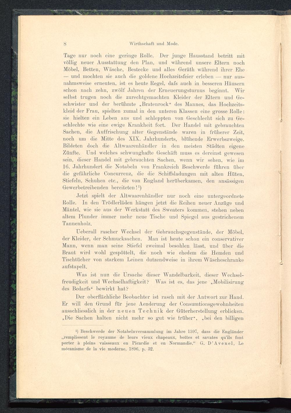 Tage nur noch eine geringe Holle. Der junge Hausstand betritt mitvöllig neuer Ausstattung den Plan, und während unsere Eltern nochMöbel, Betten, Wäsche, Bestecke und alles Geräth während ihrer Ehe— und mochten sie auch die goldene Hochzeitsfeier erleben — nur aus-nahmsweise erneuten, ist es heute Hegel , dafs auch in besseren Häusernschon nach zehn, zwölf Jahren der Erneuerungsturnus beginnt. Wirselbst trugen noch die zurechtgemachten Kleider der Eltern und Ge-schwister und der berühmte „Bratenrock“ des Mannes, das Hochzeits-kleid der Frau, spielten zumal in den unteren Klassen eine grosse Holle:sie hielten ein Leben aus und schleppten von Geschlecht sich zu Ge-schlechte wie eine ewige Krankheit fort. Der Handel mit gebrauchtenSachen, die Auffrischung alter Gegenstände waren in früherer Zeit,noch um die Mitte des XIX. Jahrhunderts, blühende Erwerbszweige.Bildeten doch die Altwaarenhändler in den meisten Städten eigeneZünfte. Und welches schwunghafte Geschäft muss es dereinst gewesensein, dieser Handel mit gebrauchten Sachen, wenn wir sehen, Avie im10. Jahrhundert die Notabein von Frankreich Beschwerde führen überdie gefährliche Concurrenz, die die Schiffsladungen mit alten Hüten.Stiefeln, Schuhen etc., die von England herüberkamen, den ansässigenGewerbetreibenden bereiteten l 1 )
