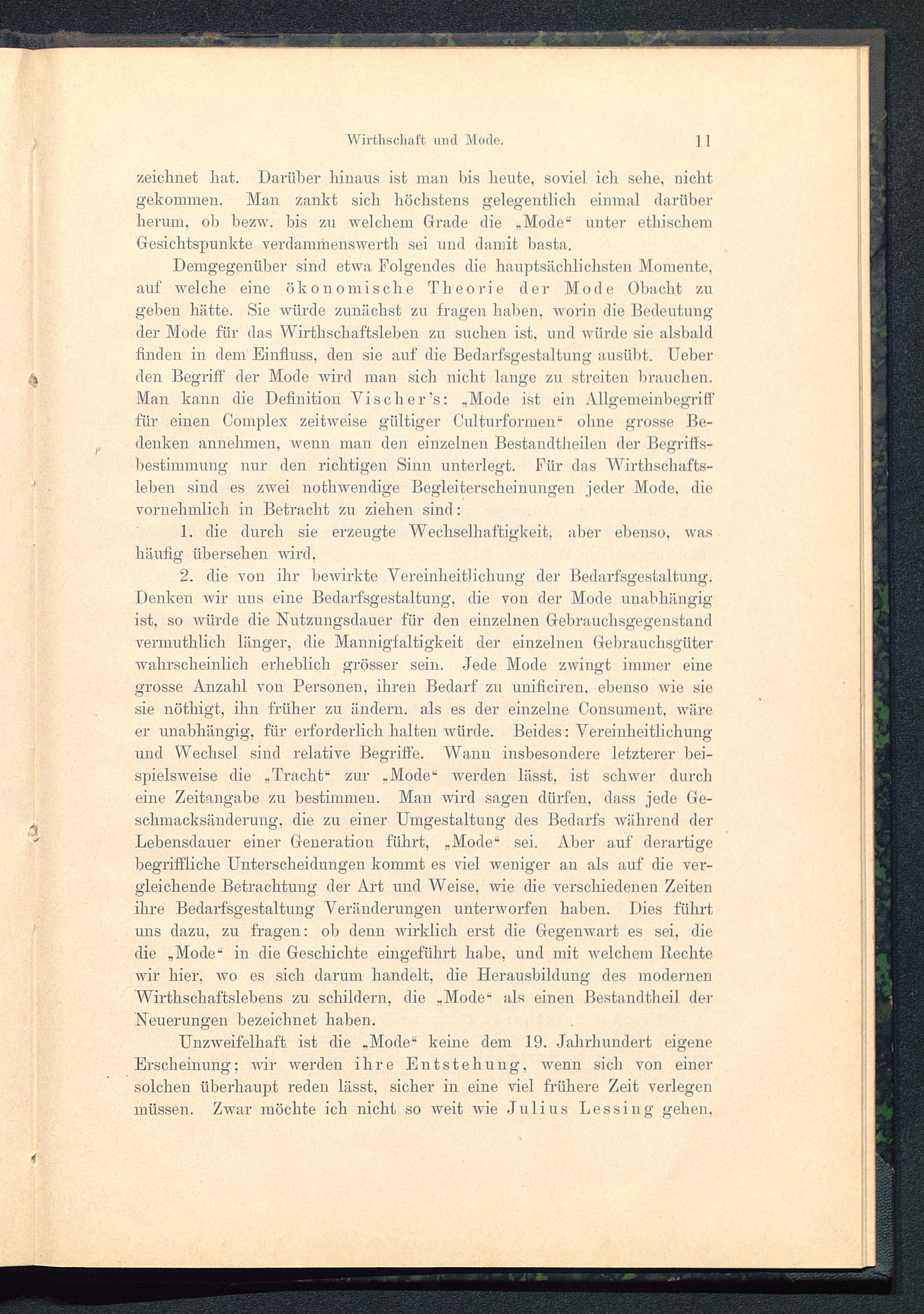 Demgegenüber sind etwa Folgendes die hauptsächlichsten Momente,auf welche eine ökonomische Theorie der Mod e Obacht zugeben hätte. Sie würde zunächst zu fragen haben, worin die Bedeutungder Mode für das Wirthschaftsleben zu suchen ist, und würde sie alsbaldfinden in dem Einfluss, den sie auf die Bedarfsgestaltung ausübt. Ueberden Begriff der Mode wird man sich nicht lange zu streiten brauchen.Man kann die Definition Yi sch er’s: .Mode ist ein Allgemeinbegrifffür einen Complex zeitweise gültiger Culturformen“ ohne grosse Be-denken annehmen, wenn man den einzelnen Bestandtheilen der Begriffs-bestimmung nur den richtigen Sinn unterlegt. Für das Wirthschafts-leben sind es zwei nothwendige Begleiterscheinungen jeder Mode, dievornehmlich in Betracht zu ziehen sind: