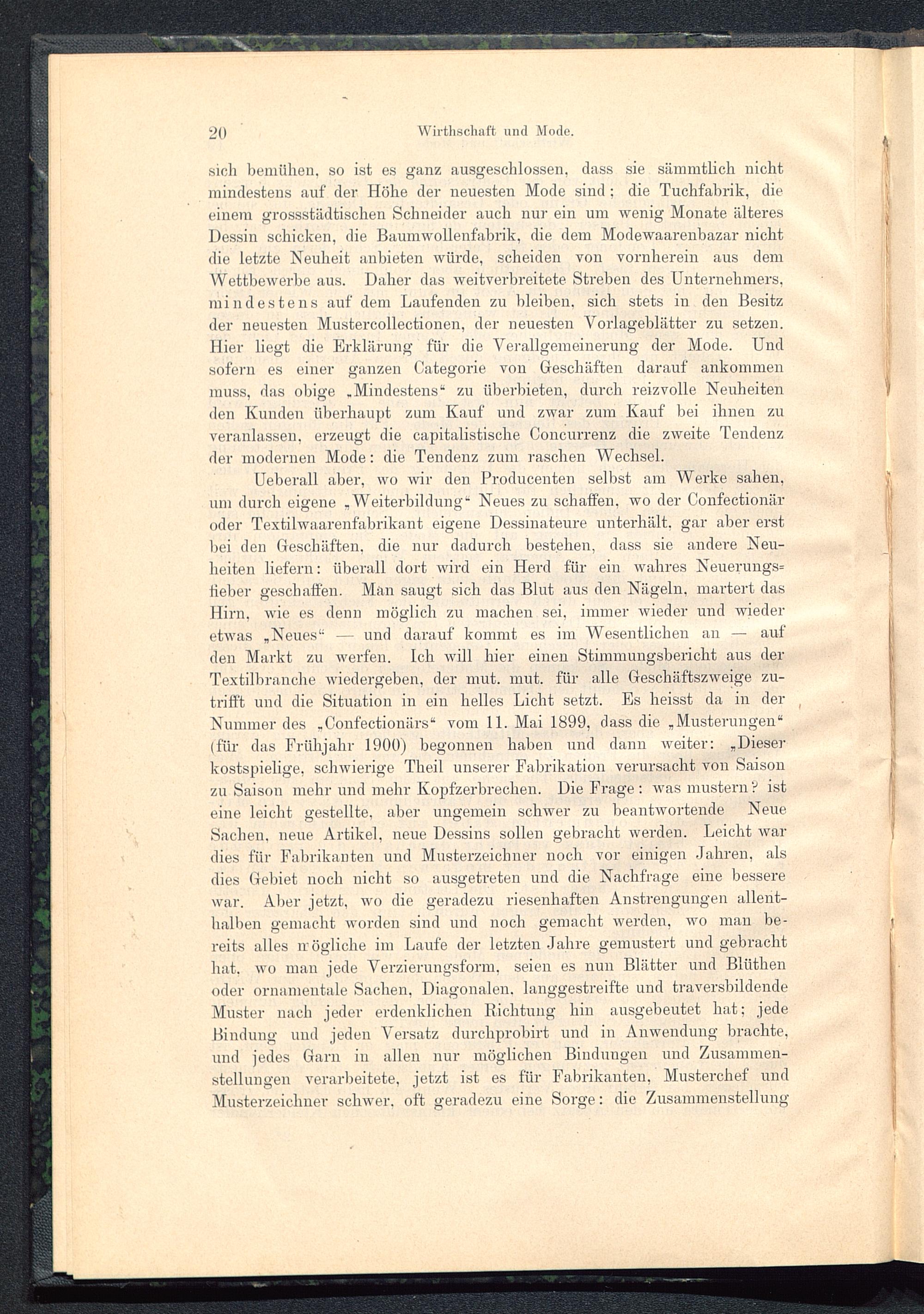 Ueberall aber, wo wir den Producenten selbst am Werke sahen,um durch eigene „Weiterbildung“ Neues zu schaffen, wo der Confectionäroder Textilwaarenfabrikant eigene Dessinateure unterhält, gar aber erstbei den Geschäften, die nur dadurch bestehen, dass sie änderte Neu-heiten liefern: überall dort wird ein Herd für ein wahres Neuerungs=lieber geschaffen. Man saugt sich das Blut aus den Nägeln, mai-tert dasHirn, wie es denn möglich zu machen sei, immer wieder und wiederetwas „Neues“ — und darauf kommt es im Wesentlichen an — aufden Markt zu werfen. Ich will hier einen Stimmungsbericht aus derTextilbranche wiedergeben, der mut. mut. für alle Geschäftszweige zu-trifft und die Situation in ein helles Licht setzt. Es heisst da in derNummer des „Confectionärs“ vom 11. Mai 1899, dass die „Musterungen“(für das Frühjahr 1900) begonnen haben und dann weiter: „Dieserkostspielige, schwierige Theil unserer Fabrikation verursacht von Saisonzu Saison mehr und mehr Kopfzerbrechen. Die Frage : was mustern ? isteine leicht gestellte, aber ungemein schwer zu beantwortende NeueSachen, neue Artikel, neue Dessins sollen gebracht werden. Leicht wardies für Fabrikanten und Musterzeichner noch vor einigen Jahren, alsdies Gebiet noch nicht so ausgetreten und die Nachfrage eine besserewar. Aber jetzt, wo die geradezu riesenhaften Anstrengungen allent-halben gemacht worden sind und noch gemacht werden, wo man be-reits alles mögliche im Laufe der letzten Jahre gemustert und gebrachthat, wo man jede Verzierungsform, seien es nun Blätter und Bliithenoder ornamentale Sachen, Diagonalen, langgestreifte und traversbildendeMuster nach jeder erdenklichen Richtung hin ausgebeutet hat; jedeBindung und jeden Versatz durchprobirt und in Anwendung brachte,und jedes Garn in allen nur möglichen Bindungen und Zusammen-stellungen verarbeitete, jetzt ist es für Fabrikanten, Musterchef undMusterzeichner schwer, oft geradezu eine Sorge: die Zusammenstellung