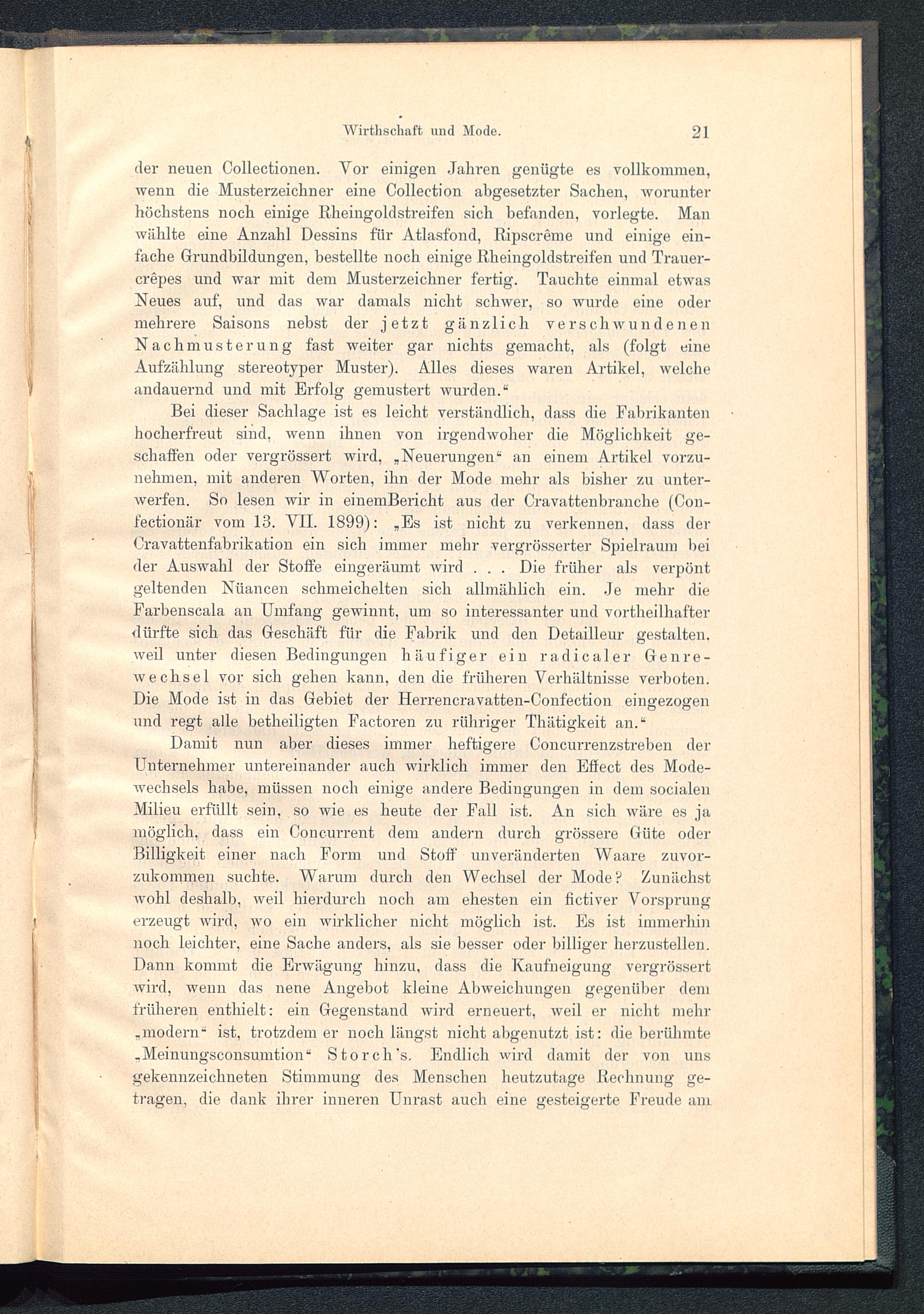 Bei dieser Sachlage ist es leicht verständlich, dass die Fabrikantenhocherfreut sind, wenn ihnen von irgendwoher die Möglichkeit ge-schaffen oder vergrössert wird, „Neuerungen“ an einem Artikel vorzu-nehmen, mit anderen Worten, ihn der Mode mehr als bisher zu unter-werfen. So lesen wir in einemBericht aus der Cravattenbranclie (Con-fectionär vom 13. VII. 1899): „Es ist nicht zu verkennen, dass derOravattenfabrikation ein sich immer mehr vergrösserter Spielraum beider Auswahl der Stoffe eingeräumt wird . . . Die früher als verpöntgeltenden Nüancen schmeichelten sich allmählich ein. Je mehr dieFarbenscala an Umfang gewinnt, um so interessanter und vortheilhafterdürfte sich das Geschäft für die Fabrik und den Detailleur gestalten,weil unter diesen Bedingungen häufiger ein radicaler Genre-wechsel vor sich gehen kann, den die früheren Verhältnisse verboten.Die Mode ist in das Gebiet der Herrencravatten-Confection einsrezosjenund regt alle betheiligten Factoren zu rühriger Thätigkeit an.“
