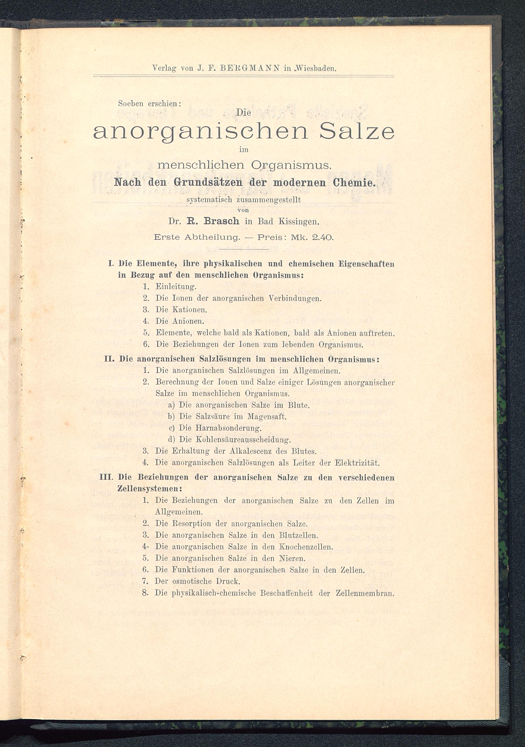 I. Die Elemente, ihre physikalischen und chemischen Eigenschaftenin Bezug anf den menschlichen Organismus: