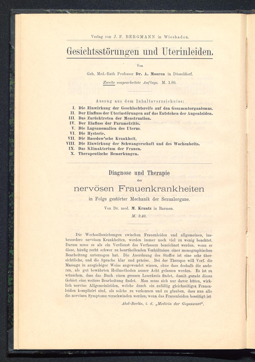 Die Wechselbeziehungen zwischen Frauenleiden und allgemeinen, ins-besondere nervösen Krankheiten, werden immer noch viel zu wenig beachtet.Darum muss es als ein Verdienst des Verfassers bezeichnet werden, wenn erdiese, häufig recht schwer zu beurtheilenden Verhältnisse einer monographischenBearbeitung unterzogen hat. Die Anordnung des Stoffes ist eine sehr über-sichtliche, und die Sprache klar und präcise. Bei der Therapie will Verf. dieMassage in ausgiebiger Weise angewendet wissen, ohne dass deshalb die ande-ren, als gut bewährten Heilmethoden ausser Acht gelassen werden. Es ist zuwünschen; dass das Buch einen grossen Leserkreis findet, damit gerade diesesGebiet eine weitere Bearbeitung findet. Man muss sich nur davor hüten, wirk-lich nervöse Allgemeinleiden, welche durch ein zufällig gleichzeitiges Frauen-leiden komplizirt sind, als solche zu verkennen und zu glauben, dass nun alledie nervösen Symptome verschwinden werden, wenn das Frauenleiden beseitigt ist