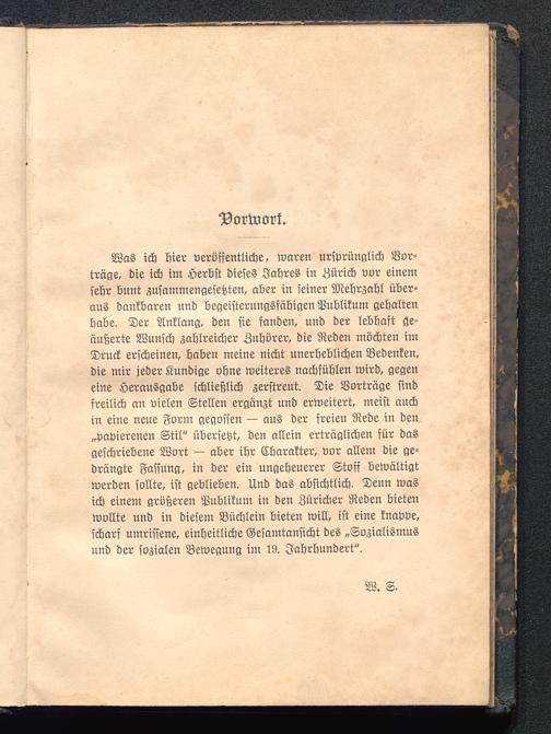 Was ich hier veröffentliche, waren ursprünglich Vor-träge, die ich im Herbst dieses Jahres in Zürich vor einemsehr bunt zusammengesetzten, aber in seiner Mehrzahl über-aus dankbaren und begeisterungsfähigen Publikum gehaltenhabe. Der Anklang, den sie fanden, und der lebhaft ge-äußerte Wunsch zahlreicher Zuhörer, die Reden möchten imDruck erscheinen, haben meine nicht unerheblichen Bedenken,die mir jeder Kundige ohne weiteres nachfühlen wird, gegeneine Herausgabe schließlich zerstreut. Die Vorträge sindfreilich an vielen Stellen ergänzt und erweitert, meist auchin eine neue Form gegossen — aus der freien Rede in den„papierenen Stil" übersetzt, den allein erträglichen für dasgeschriebene Wort — aber ihr Charakter, vor allem die ge-drängte Fassung, in der ein ungeheuerer Stoff bewältigtwerden sollte, ist geblieben. Und das absichtlich. Denn wasich einem größeren Publikum in den Züricher Reden bietenwollte und in diesem Büchlein bieten will, ist eine knappe,scharf umrissene, einheitliche Gesamtansicht des „Sozialismusund der sozialen Bewegung im 19. Jahrhundert".