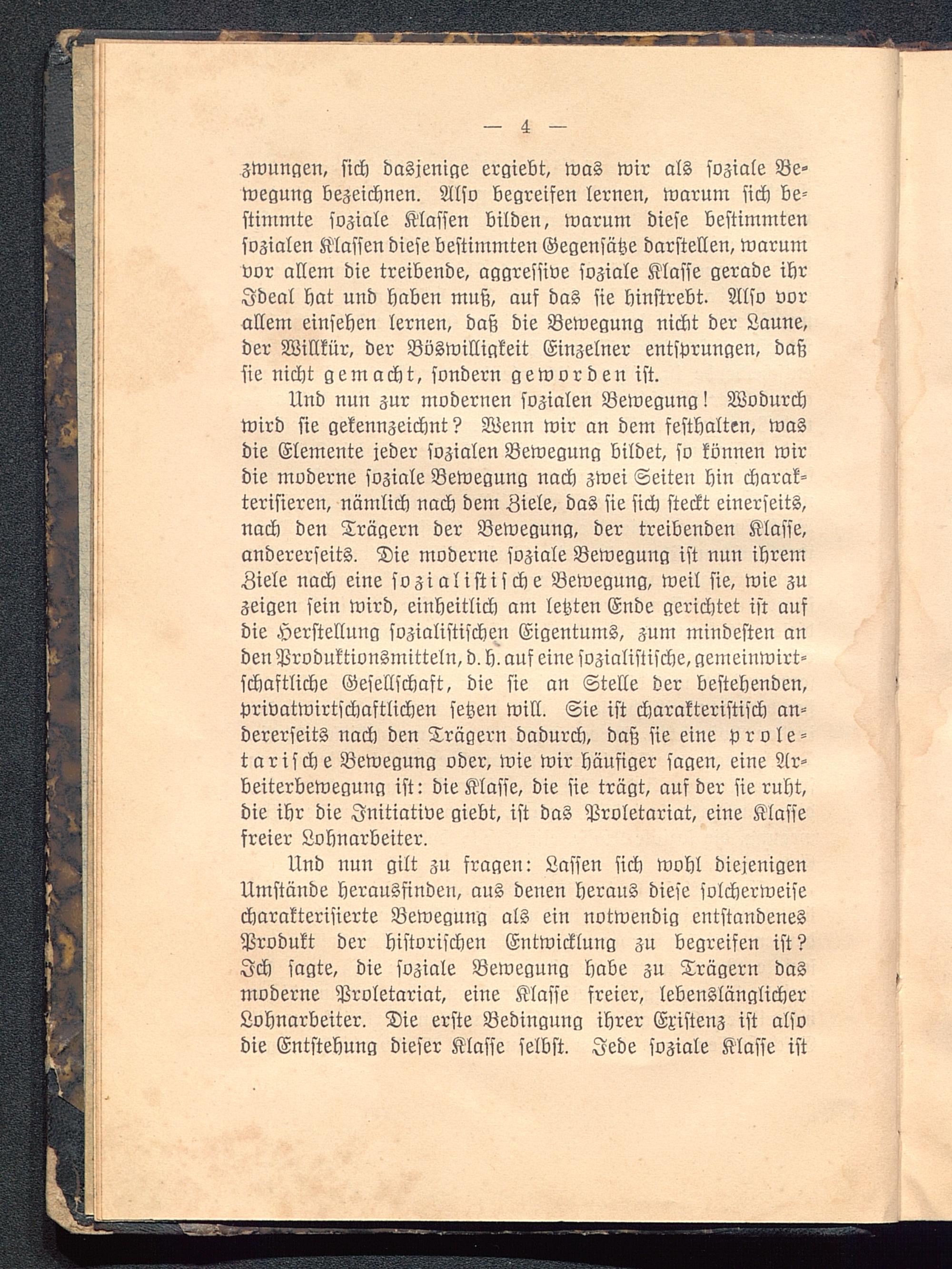 Und nun zur modernen sozialen Bewegung! Wodurchwird sie gekennzeichnt? Wenn wir an dem festhalten, wasdie Elemente jeder sozialen Bewegung bildet, so können wirdie moderne soziale Bewegung nach zwei Seiten hin charak-terisieren, nämlich nach dem Ziele, das sie sich steckt einerseits,nach den Trägern der Bewegung, der treibenden Klasse,andererseits. Die moderne soziale Bewegung ist nun ihremZiele nach eine sozialistische Bewegung, weil sie, wie zuzeigen sein wird, einheitlich am letzten Ende gerichtet ist aufdie Herstellung sozialistischen Eigentums, zum mindesten anden Produktionsmitteln, d. h. auf eine sozialistische, gemeinwirt-schaftliche Gesellschaft, die sie an Stelle der bestehenden,privatwirtschaftlichen setzen will. Sie ist charakteristisch an-dererseits nach den Trägern dadurch, daß sie eine prole-tarische Bewegung oder, wie wir häufiger sagen, eine Ar-beiterbewegung ist: die Klasse, die sie trägt, auf der sie ruht,die ihr die Initiative giebt, ist das Proletariat, eine Klassefreier Lohnarbeiter.