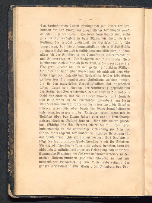 Das kaufmännische Talent schwingt sich zum Leiter der Pro-duktion auf und zwingt die große Menge der bloßen Hand-arbeiter in seinen Dienst. Sie wird dann weiter noch mehrzu einer Notwendigkeit in dem Maße, wie durch die Ent-wicklung der Produktionstechnik die Betriebe sich so sehrvergrößern, daß die Zusammensassuug vieler Arbeitskräftezu eiuem Arbeitsprozeß technisch unvermeidlich wird, also vorallem seit der Einführung des Dampfes in Güterproduktionund Gütertransport. Die Trägerin der kapitalistischen Pro-duktionsweise, die Klasse, die sie vertritt, ist die Bo urgeoisie-Wie geru spräche ich von der großen historischen Mission,die sie erfüllt bat? Aber wieder muß ich mich mit dem Hin-weise begnügen, daß als das Wesentliche solcher historischenMission wir die wunderbare Entfaltung ansehen müssen,die sie den materiellen Produktivkräften hat angedeihenlassen. Unter dem Zwange der Konkurrenz, gepeischt vonder Geißel des Erwerbstriebes, der mit ihr in die moderneGeschichte eintritt, hat sie uns sene Märchen aus Tausendund Eine Nacht in die Wirklichkeit gezaubert, au derenWundern wir uns täglich freuen, wenn wir durch die Straßeuunserer Großstädte oder durch die GeWerbeausstellungenschlendern, wenn wir mit den Antipoden reden, wenn wir inPalästen über den Ozean fahren oder uns in dem Glänzeunserer üppigen Salons sonnen. Was für unsere Zweckedas Wichtige ist: Die Existenz dieser kapitalistischen Pro-duktionsweise ist die notwendige Bedingung für diejenigeKlasse, die Trägerin der modernen, sozialen Bewegung ist:«das Proletariat. Ich sagte schon vorher: Das Proletariatfolgt der kapitalistischen Produktionsweise wie ihr Schatten.Diese Produktionsweise kann nicht anders bestehen, kann sichnicht anders entfalten als unter der Bedingung, daß unter demKommando Einzelner sich Scharen besitzloser Arbeiter in dengroßen Unternehmungen zusammenschließen; sie hat zurnotwendigen Voraussetzung eine Auseinanderreißung derganzen Gesellschaft in zwei Klassen, den Inhabern der Pro-