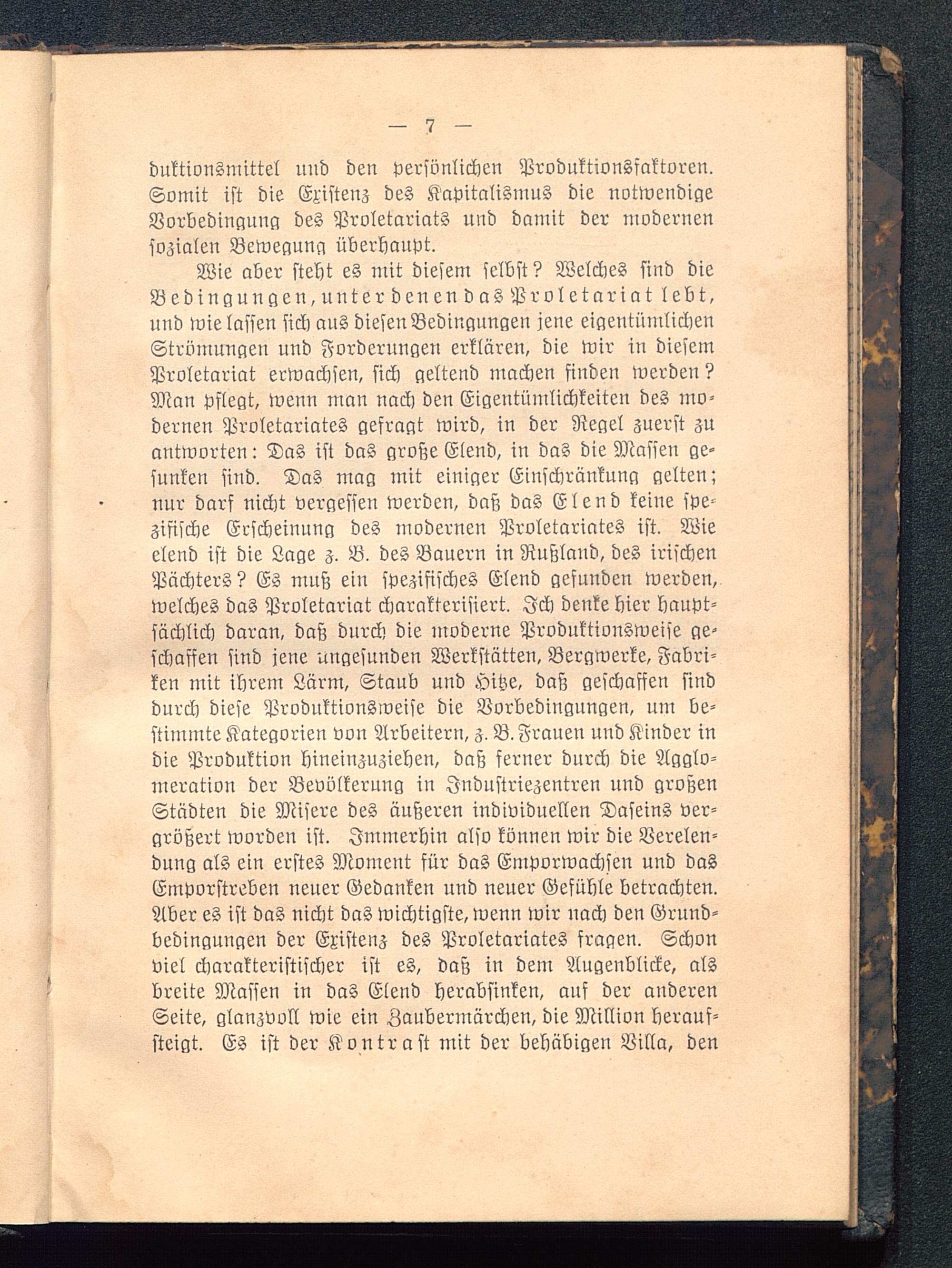 Wie aber steht es mit diesem selbst? Welches sind dieBeding» ngen,unterdenendas Proletariatlebt,und wie lassen sich aus diesen Bedingungen jene eigentümlichenStrömungen und Forderungen erklären, die wir in diesemProletariat erwachsen, sich geltend machen finden werden?Man pslegt, wenn man nach den Eigentümlichkeiten des mo-dernen Proletariates gefragt wird, in der Regel zuerst zuantworten: Das ist das große Elend, in das die Massen ge-sunken sind. Das mag mit einiger Einschränkung gelten;nur darf nicht vergessen werden, daß das Elend keine spe-zifische Erscheinung des modernen Proletariates ist. Wieelend ist die Lage z. B. des Baueru in Rußland , des irischenPächters? Es musz ein spezifisches Elend gefunden werden,welches das Proletariat charakterisiert. Ich denke hier haupt-sächlich daran, daß durch die moderne Produktionsweise ge-schaffen sind jene ungesunden Werkstätten. Bergwerke, Fabri-ken mit ihrem Lärm, Staub und Hitze, daß geschaffen sinddurch diese Produktionsweise die Vorbedingungen, um be-stimmte Kategorien von Arbeitern, z. B. Frauen und Kinder indie Produktion hineinzuziehen, daß ferner durch die Agglo-meration der Bevölkerung in Industriezentren und großenStädten die Misere des äußeren individuellen Daseins ver-größert worden ist. Immerhin also können wir die Verelen-dung als ein erstes Moment für das Emporwachsen und dasEmporstreben neuer Gedanken nnd neuer Gefühle betrachten.Aber es ist das nicht das wichtigste, wenn wir nach den Grund-bedingungen der Existenz des Proletariates fragen. Schonviel charakteristischer ist es, daß in dem Augenblicke, alsbreite Massen in das Elend herabsinken, ans der anderenSeite, glanzvoll wie ein Zaubermärchen, die Million herauf-steigt. Es ist der Kontrast mit der behäbigen Villa, den