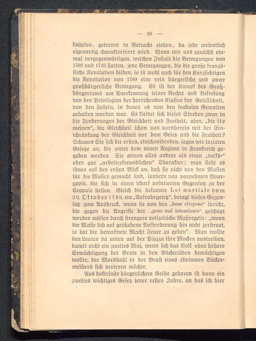 knüpfen, getrennt in Betracht ziehen, da jede wesentlicheigenartig charakterisiert wird. Wenn wir uns zunächst ein-mal vergegenwärtigen, welchen Inhalt die Bewegungen von1789 und 1793 hatten, jene Bewegungen, die die große franzö-sische Revolution bilden, so ist Wohl auch für den Kurzsichtigendie Revolution von 1739 eine rein bürgerliche und zwargroßbürgerliche Bewegung, Es ist der Kampf des Groß-bürgertums um Anerkennung seiner Rechte und Befreiungvon den Privilegien der herrschenden Klassen der Gesellschaft,von den Fesseln, in denen es von den feudalen Gewaltengehalten worden war. Es kleidet sich dieses Streben zwar indie Forderungen der Gleichheit und Freiheit, aber, „die siemeinen", die Gleichheit schon von vornherein mit der Ein-schränkung der Gleichheit vor dem Gesetz und die Freiheit?Schauen Sie sich die ersten, einschneidenden, sagen wir sozialenGesetze an, die unter dem neuen Regime in Frankreich ge-geben werden, Sie atmen alles andere als einen „Volks-"oder gar „arbeiterfreundlichen" Charakter; man sieht esihnen auf den ersten Blick an, daß sie nicht von den Massenfür die Massen gemacht find, sondern von vornehmen Bour-geois, die sich in einen scharf pointierten Gegensatz zu derCrapule stellen. Gleich die bekannte I,oi wartialovom2 0. Oktober 1739, ein „Aufruhrgesetz", bringt diesen Gegen-satz zum Ausdruck, wenn sie von den „dons cito)'«»«" spricht,die gegen die Angriffe der „?°ns mal inwntion6s" geschütztwerden müssen durch strengere polizeiliche Maßregeln: „wenndie Masse sich auf geschehene Aufforderung hin nicht zerstreut,so hat die bewaffnete Macht Feuer zu geben". Man wollteden Leuten da nnten auf der Piazza ihre Mucken austreiben,damit nicht ein zweites Mal, wenn sich das Volk ohne höhereErmächtigung der Brote in den Bäckerläden bemächtigenwollte, der Mvrdstahl in der Brust eines ehrsamen Bäcker-meisters sich verirren möchte.