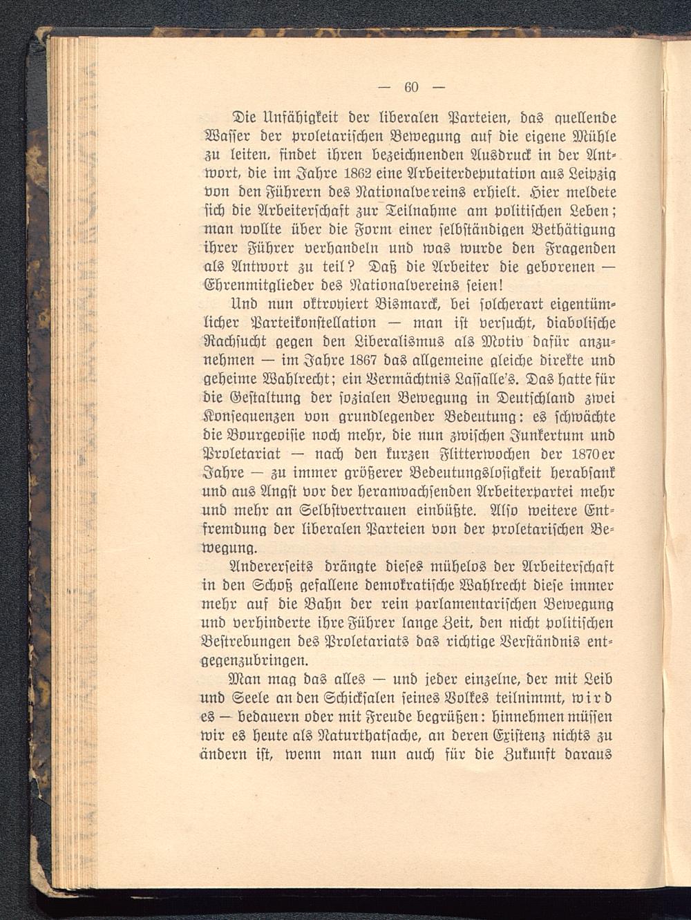 Andererseits drängte dieses mühelos der Arbeiterschaftin den Schoß gefallene demokratische Wahlrecht diese immermehr auf die Bahn der rein parlamentarischen Bewegungund verhinderte ihre Führer lange Zeit, den nicht politischenBestrebungen des Proletariats das richtige Verständnis ent-gegenzubringen.