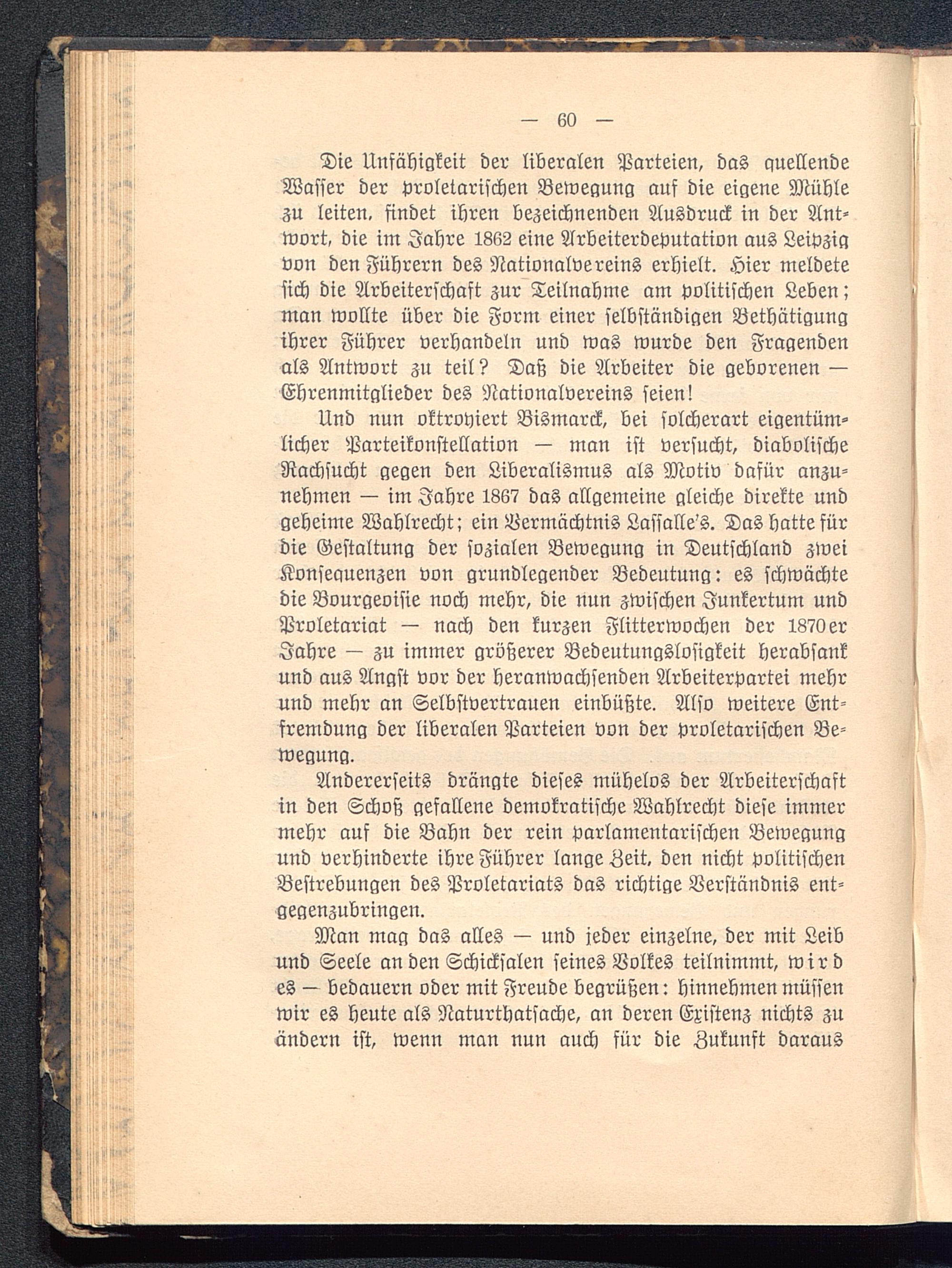 Die Unfähigkeit der liberalen Parteien, das quellendeWasser der proletarischen Bewegung auf die eigene Mühlezu leiten, findet ihren bezeichnenden Ausdruck in der Ant-wort, die im Jahre 1862 eine Arbeiterdeputation aus Leipzig von den Führern des Nationalvereins erhielt. Hier meldetesich die Arbeiterschaft zur Teilnahme am politischen Leben;man wollte über die Form einer selbständigen Bethätigungihrer Führer verhandeln und was wurde den Fragendenals Antwort zu teil? Daß die Arbeiter die geborenen ^Ehrenmitglieder des Nationalvereins seien!