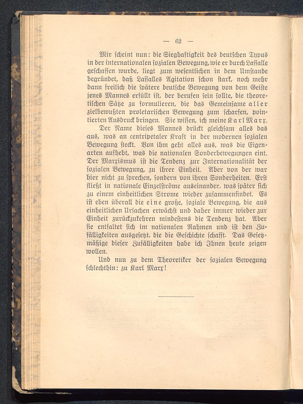 Mir scheint nun: die Sieghaftigkeit des deutschen Typusin der internationalen sozialen Bewegung, wie er durch Lassallegeschaffen wurde, liegt zum wesentlichen in dem Umständebegründet, daß Lassalles Agitation schon stark, noch mehrdann freilich die spätere deutsche Bewegung von dem Geistejenes Mannes erfüllt ist, der berufen sein sollte, die theore-tischen Sätze zu formulieren, die das Gemeinsame allerzielbewußten proletarischen Bewegung zum scharfen, poin-tierten Ausdruck bringen, Sie wissen, ich meine KarlMarx.