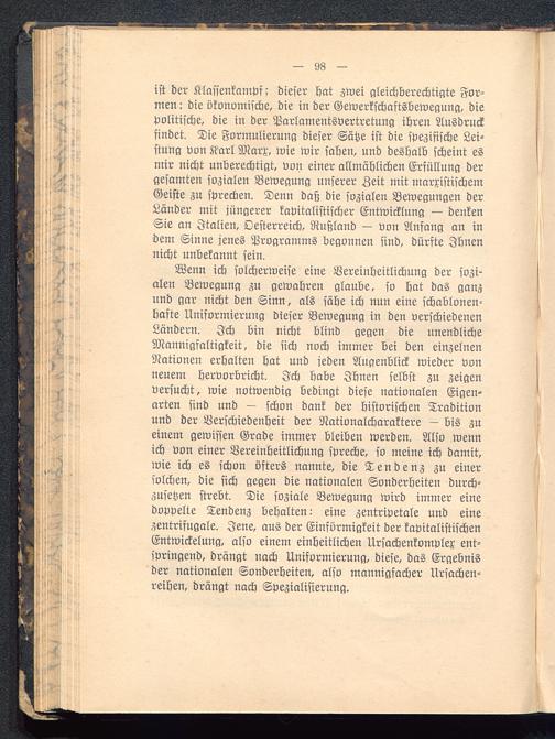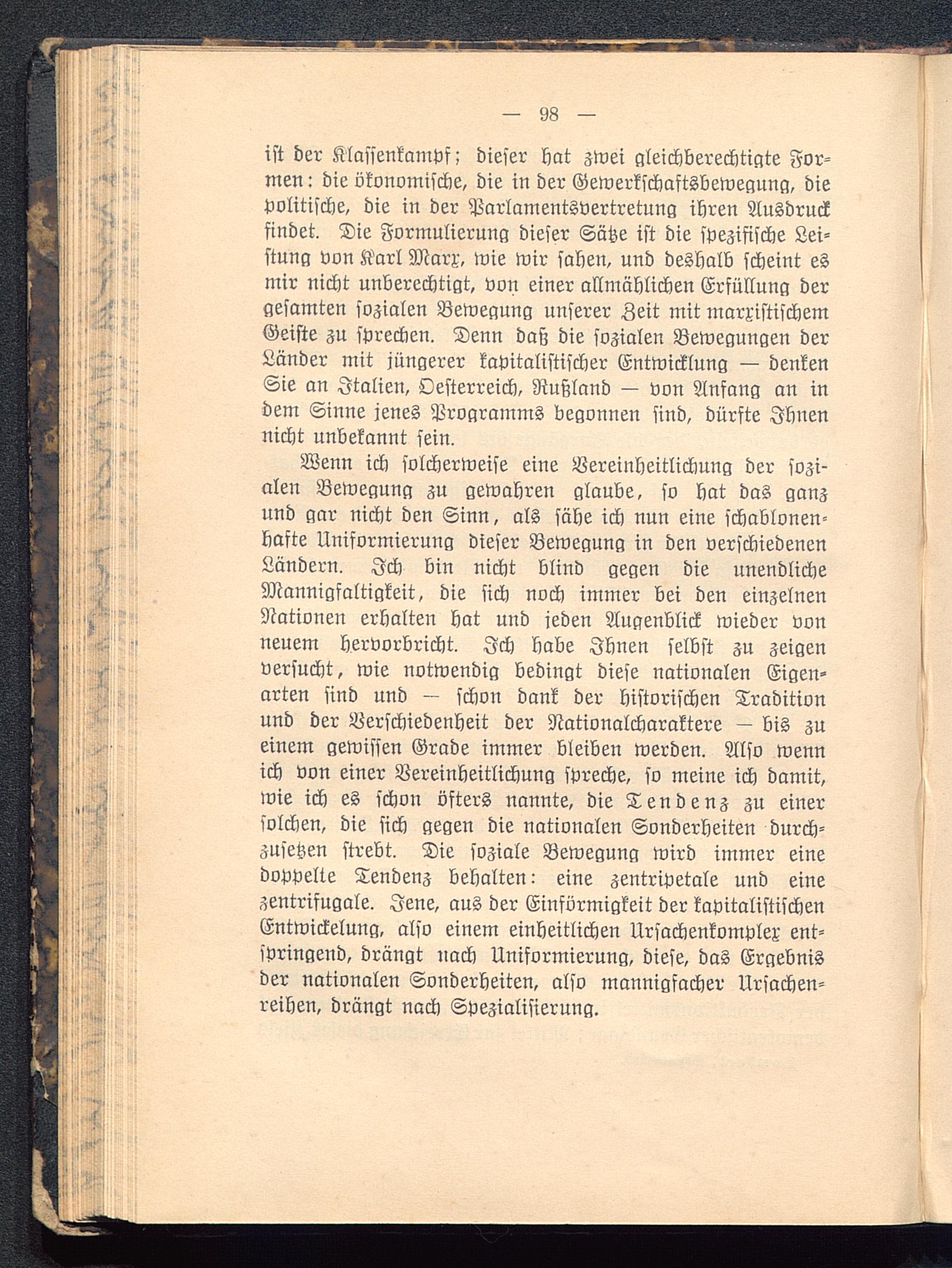 ist der Klassenkampf; dieser hat zwei gleichberechtigte For-men : die ökonomische, die in der Gewerkschaftsbewegung, diepolitische, die in der Parlamentsvertretung ihren Ausdruckfindet. Die Formulierung dieser Sätze ist die spezifische Lei-stung von Karl Marx , wie wir sahen, und deshalb scheint esmir nicht unberechtigt, von einer allmählichen Erfüllung dergesamten sozialen Bewegung unserer Zeit mit marxistischemGeiste zu sprechen. Denn dasz die sozialen Bewegungen derLänder mit jüngerer kapitalistischer Entwicklung ^ denkenSie an Italien, Oesterreich, Rußland — von Anfang an indem Sinne jenes Programms begonnen sind, dürfte Ihnennicht unbekannt sein.