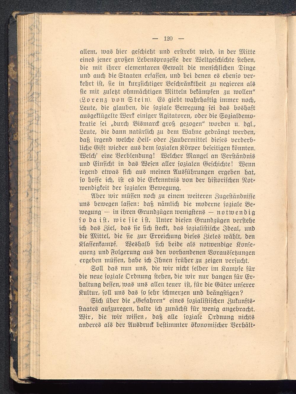 Aber wir müssen noch zu einem weiteren Zugeständnisseuns bewegen lassen: daß nämlich die moderne soziale Be-wegung — in ihren Grundzügen wenigstens — notwendigso da ist, wie sie ist. Unter diesen Grundzügen versteheich das Ziel, das sie sich steckt, das sozialistische Ideal, unddie Mittel, die sie zur Erreichung dieses Zieles wählt, denKlassenkampf. Weshalb sich beide als notwendige Konse-quenz und Folgerung aus den vorhandenen Voraussetzungenergeben müssen, habe ich Ihnen früher zu zeigen versucht.
