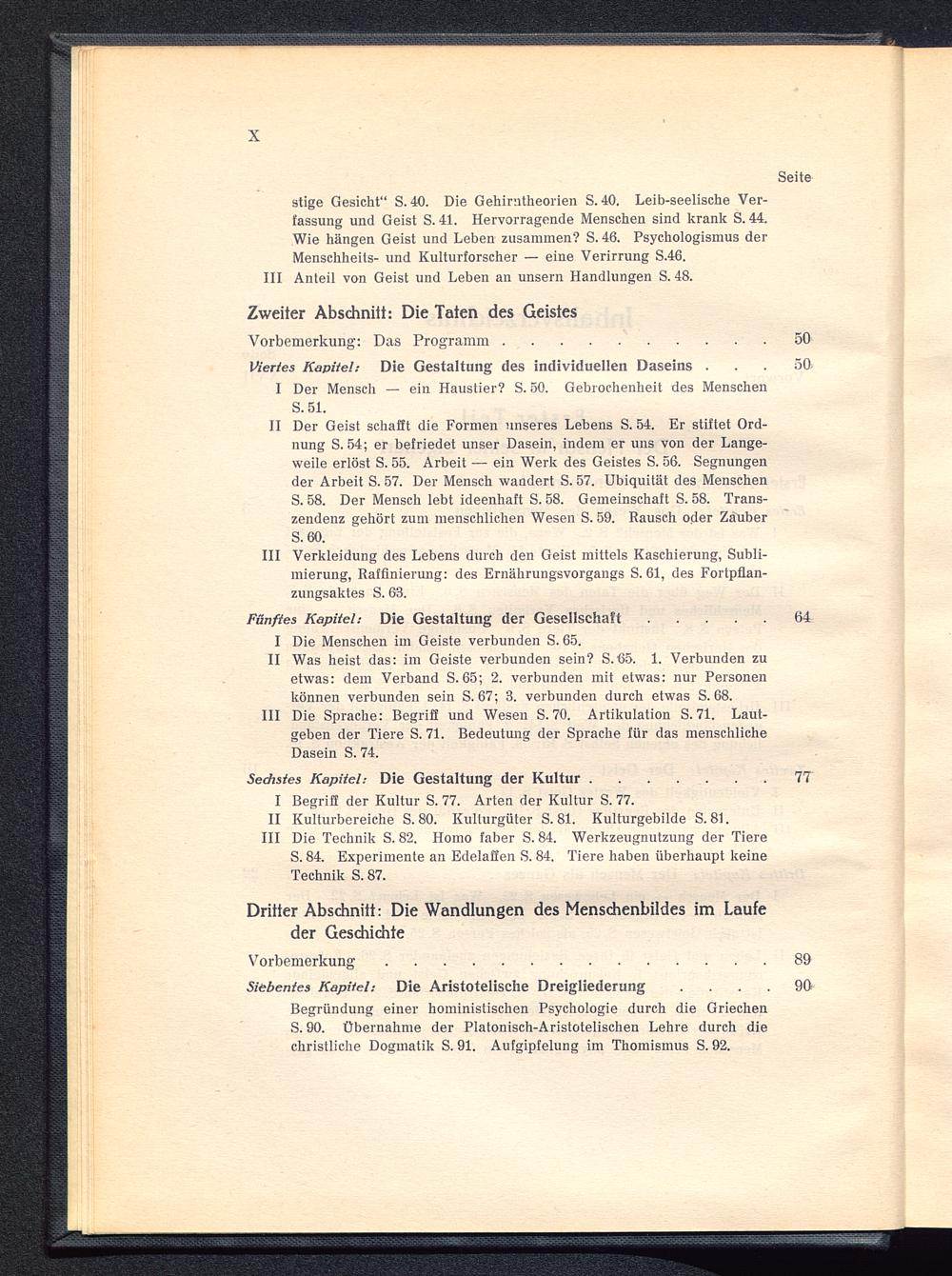 II Der Geist schafft die Formen unseres Lebens S. 54. Er stiftet Ord-nung S. 54; er befriedet unser Dasein, indem er uns von der Lange-weile erlöst S. 55. Arbeit — ein Werk des Geistes S. 56. Segnungender Arbeit S. 57. Der Mensch wandert S. 57. Ubiquität des MenschenS. 58. Der Mensch lebt ideenhaft S. 58. Gemeinschaft S. 58. Trans-zendenz gehört zum menschlichen Wesen S. 59. Rausch oder ZauberS. 60.