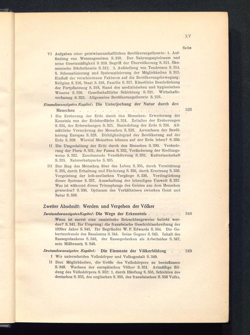 II Drei Möglichkeiten, die Größe des Volkskörpers zu beeinflussenS. 349. Wachsen der europäischen Völker S. 351. Artmäßige Bil-dung des Volkskörpers S. 352: 1. durch Häufung S. 355, Schichten desdeutschen S. 355, des englischen S. 355, des französischen S. 356 Volks,