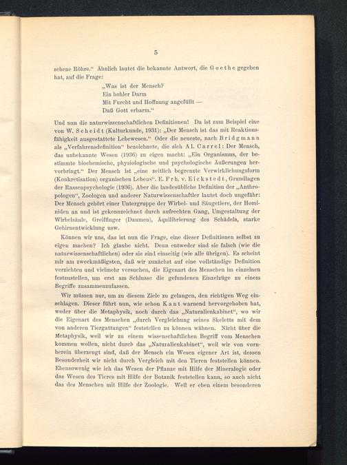 Und nun die naturwissenschaftlichen Definitionen! Da ist zum Beispiel einevon W. Scheidt (Kulturkunde, 1931): „Der Mensch ist das mit Reaktions-fähigkeit ausgestattete Lebewesen.“ Oder die neueste, nach Bridgmannals „Verfahrensdefinition“ bezeichnete, die sich Al. Carrel: Der Mensch,das unbekannte Wesen (1936) zu eigen macht: „Ein Organismus, der be-stimmte biochemische, physiologische und psychologische Äußerungen her-vorbringt.“ Der Mensch ist „eine zeitlich begrenzte Verwirklichungsform(Konkretisation) organischen Lebens“. E. F r h. v. E i c k s t e d t, Grundlagender Rassenpsychologie (1936). Aber die landesübliche Definition der „Anthro-pologen“, Zoologen und anderer Naturwissenschaftler lautet doch ungefähr:Der Mensch gehört einer Untergruppe der Wirbel- und Säugetiere, der Homi-niden an und ist gekennzeichnet durch aufrechten Gang, Umgestaltung derWirbelsäule, Greiffinger (Daumen), Äquilibrierung des Schädels, starkeGehirnentwicklung usw.