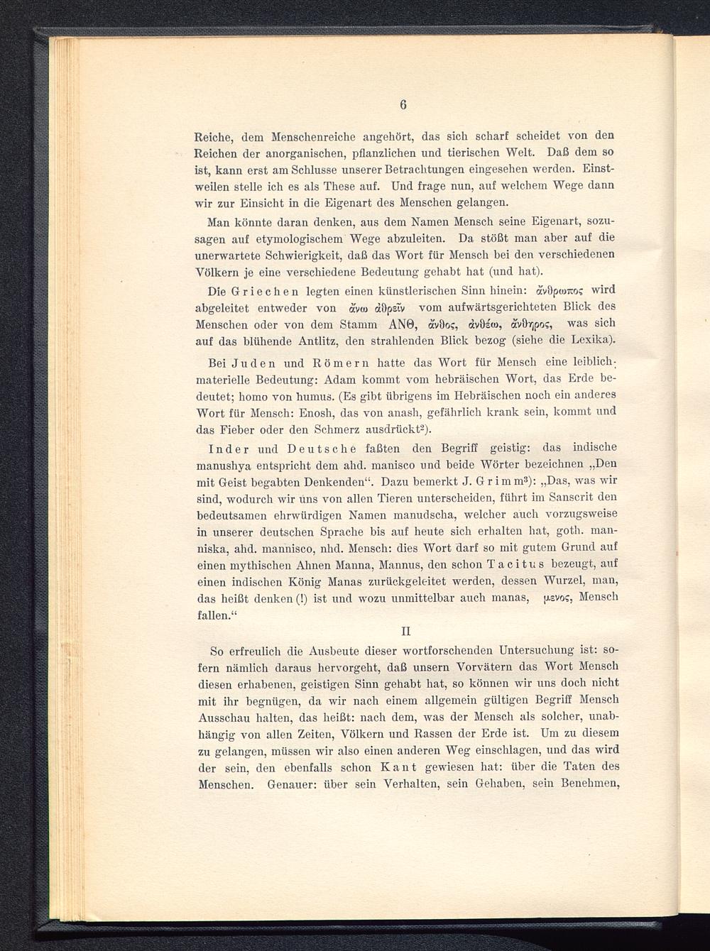 Man könnte daran denken, aus dem Namen Mensch seine Eigenart, sozu-sagen auf etymologischem Wege abzuleiten. Da stößt man aber auf dieunerwartete Schwierigkeit, daß das Wort für Mensch bei den verschiedenenVölkern je eine verschiedene Bedeutung gehabt hat (und hat).