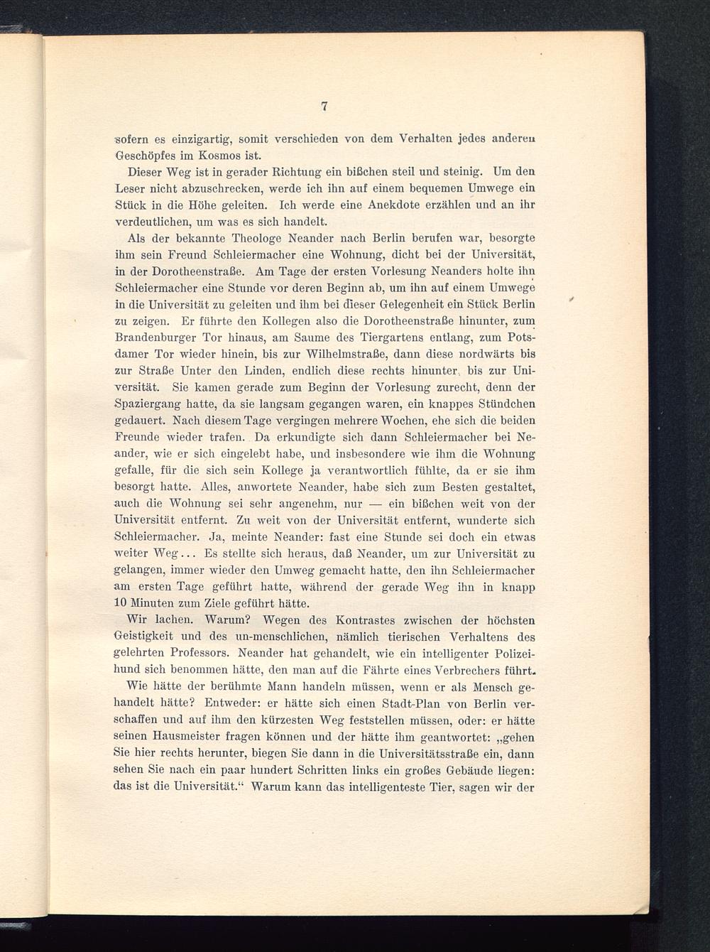 Als der bekannte Theologe Neander nach Berlin berufen war, besorgteihm sein Freund Schleiermacher eine Wohnung, dicht bei der Universität,in der Dorotheenstraße. Am Tage der ersten Vorlesung Neanders holte ihnSchleiermacher eine Stunde vor deren Beginn ab, um ihn auf einem Umwegein die Universität zu geleiten und ihm bei dieser Gelegenheit ein Stück Berlin zu zeigen. Er führte den Kollegen also die Dorotheenstraße hinunter, zumBrandenburger Tor hinaus, am Saume des Tiergartens entlang, zum Pots-damer Tor wieder hinein, bis zur Wilhelmstraße, dann diese nordwärts biszur Straße Unter den Linden , endlich diese rechts hinunter, bis zur Uni-versität. Sie kamen gerade zum Beginn der Vorlesung zurecht, denn derSpaziergang hatte, da sie langsam gegangen waren, ein knappes Stündchengedauert. Nach diesem Tage vergingen mehrere Wochen, ehe sich die beidenFreunde wieder trafen. Da erkundigte sich dann Schleiermacher bei Ne-ander, wie er sich eingelebt habe, und insbesondere wie ihm die Wohnunggefalle, für die sich sein Kollege ja verantwortlich fühlte, da er sie ihmbesorgt hatte. Alles, anwortete Neander, habe sich zum Besten gestaltet,auch die Wohnung sei sehr angenehm, nur — ein bißchen weit von derUniversität entfernt. Zu weit von der Universität entfernt, wunderte sichSchleiermacher . Ja, meinte Neander: fast eine Stunde sei doch ein etwasweiter Weg... Es stellte sich heraus, daß Neander, um zur Universität zugelangen, immer wieder den Umweg gemacht hatte, den ihn Schleiermacher am ersten Tage geführt hatte, während der gerade Weg ihn in knapp10 Minuten zum Ziele geführt hätte.