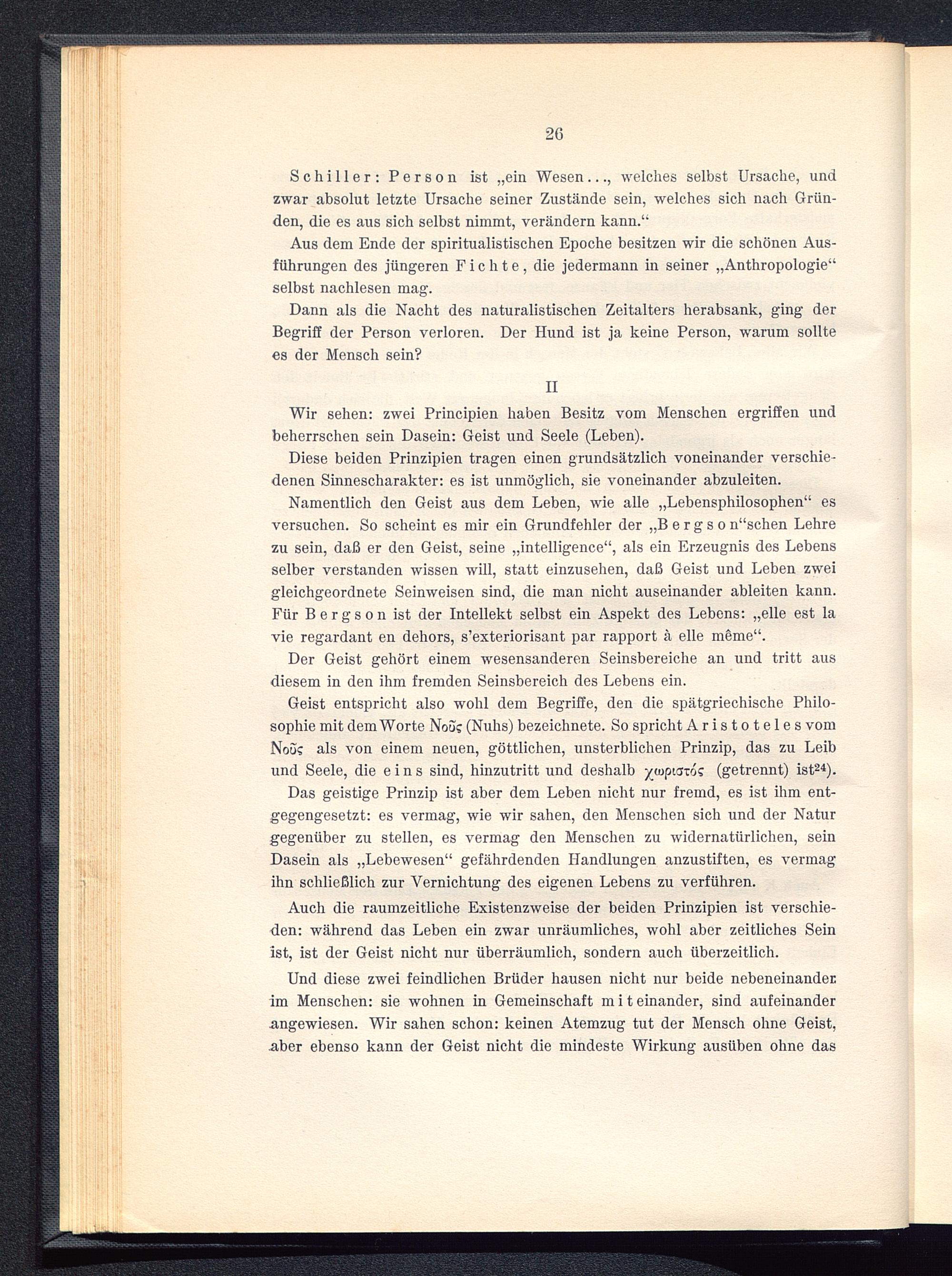 Geist entspricht also wohl dem Begriffe, den die spätgriechische Philo-sophie mit dem Worte Noos (Nuhs) bezeichnete. So spricht Aristoteles vomNoüs als von einem neuen, göttlichen, unsterblichen Prinzip, das zu Leibund Seele, die eins sind, hinzutritt und deshalb y tuptaros (getrennt) ist 24 ).