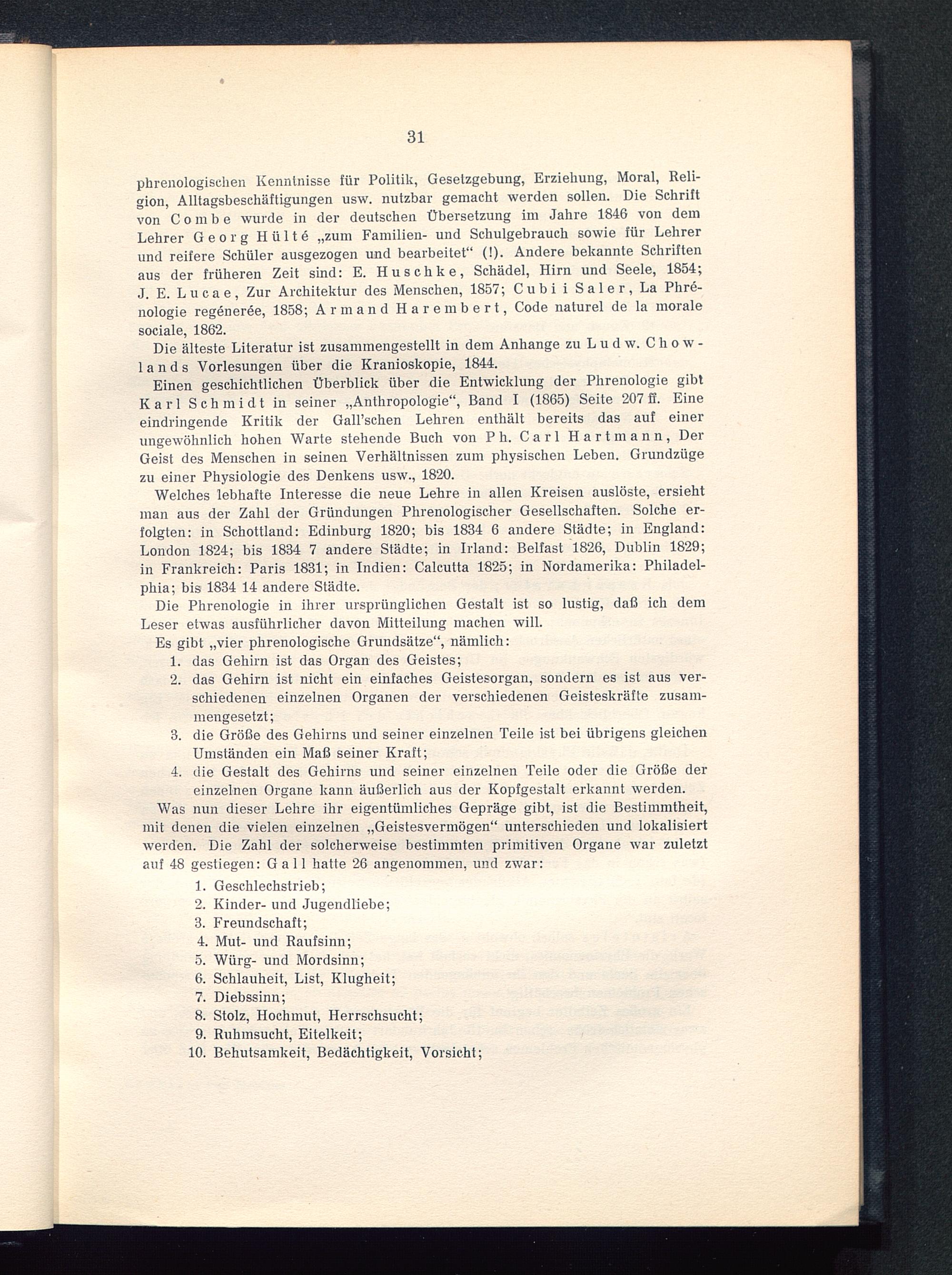Was nun dieser Lehre ihr eigentümliches Gepräge gibt, ist die Bestimmtheit,mit denen die vielen einzelnen „Geistesvermögen“ unterschieden und lokalisiertwerden. Die Zahl der solcherweise bestimmten primitiven Organe war zuletztauf 48 gestiegen: Gail hatte 26 angenommen, und zwar: