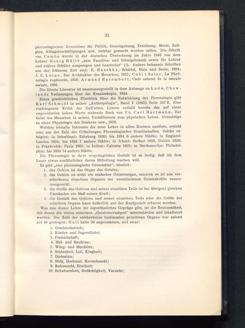 phrenologischen Kenntnisse für Politik, Gesetzgebung, Erziehung, Moral, Reli-gion, Alltagsbeschäftigungen usw. nutzbar gemacht werden sollen. Die Schriftvon Co 111 b e wurde in der deutschen Übersetzung im Jahre 1846 von demLehrer Georg Hülte „zum Familien- und Schulgebrauch sowie für Lehrerund reifere Schüler ausgezogen und bearbeitet“ (!). Andere bekannte Schriftenaus der früheren Zeit sind: E. Huschke, Schädel, Hirn und Seele, 1854;J. E. Lucae, Zur Architektur des Menschen, 1857; Cubi i Saler, La Phre-nologie regeneree, 1858; Armand Harembert, Code naturel de la moralesociale, 1862.