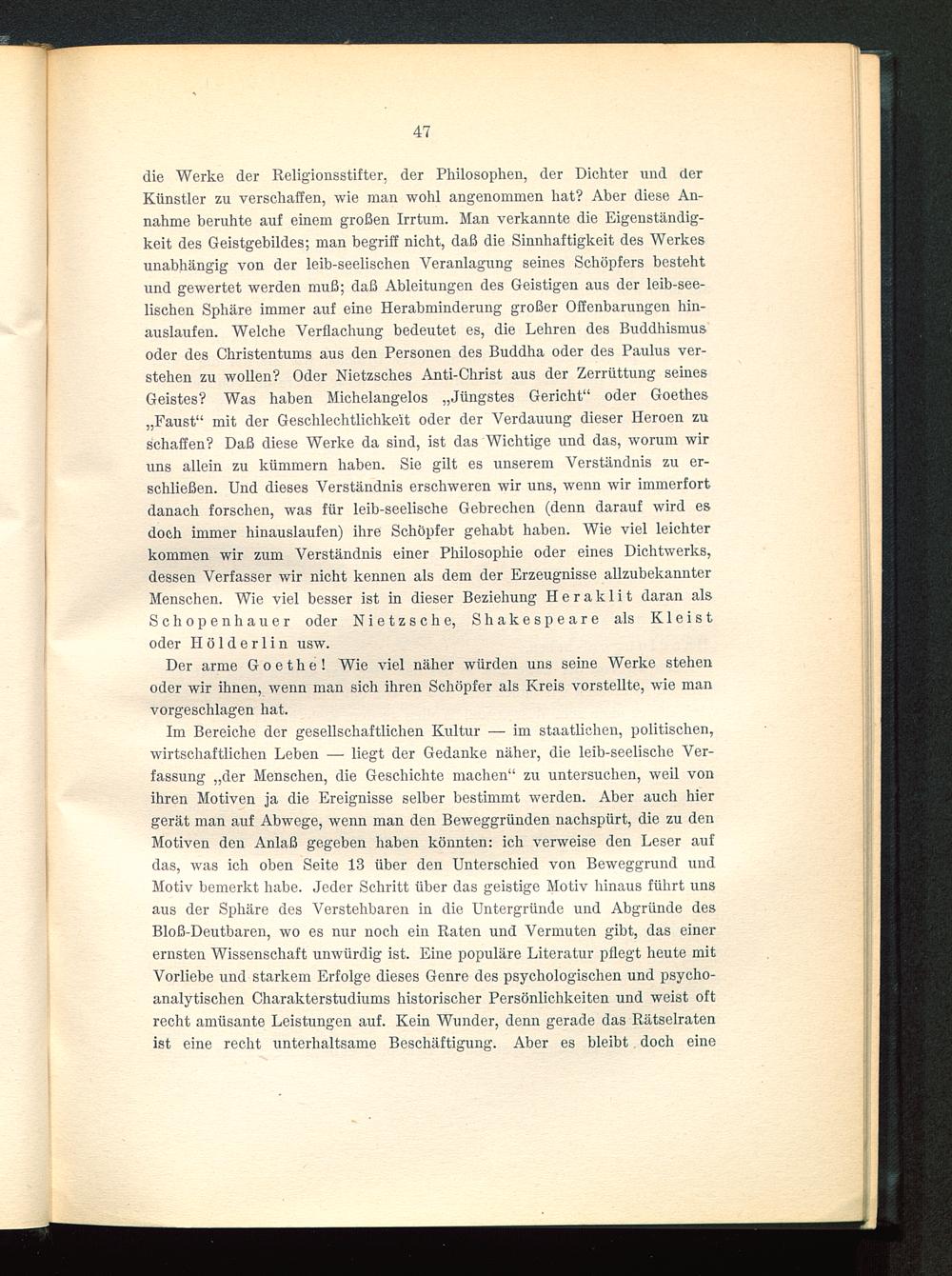 die Werke der Religionsstifter, der Philosophen, der Dichter und derKünstler zu verschaffen, wie man wohl angenommen hat? Aber diese An-nahme beruhte auf einem großen Irrtum. Man verkannte die Eigenständig-keit des Geistgebildes; man begriff nicht, daß die Sinnhaftigkeit des Werkesunabhängig von der leib-seelischen Veranlagung seines Schöpfers bestehtund gewertet werden muß; daß Ableitungen des Geistigen aus der leib-see-lischen Sphäre immer auf eine Herabminderung großer Offenbarungen hin-auslaufen. Welche Verflachung bedeutet es, die Lehren des Buddhismus oder des Christentums aus den Personen des Buddha oder des Paulus ver-stehen zu wollen? Oder Nietzsches Anti-Christ aus der Zerrüttung seinesGeistes? Was haben Michelangelos „Jüngstes Gericht“ oder Goethes„Faust “ mit der Geschlechtlichkeit oder der Verdauung dieser Heroen zuschaffen? Daß diese Werke da sind, ist das Wichtige und das, worum wiruns allein zu kümmern haben. Sie gilt es unserem Verständnis zu er-schließen. Und dieses Verständnis erschweren wir uns, wenn wir immerfortdanach forschen, was für leib-seelische Gebrechen (denn darauf wird esdoch immer hinauslaufen) ihre Schöpfer gehabt haben. Wie viel leichterkommen wir zum Verständnis einer Philosophie oder eines Dichtwerks,dessen Verfasser wir nicht kennen als dem der Erzeugnisse allzubekannterMenschen. Wie viel besser ist in dieser Beziehung H e r a k 1 i t daran alsSchopenhauer oder Nietzsche, Shakespeare als Kleistoder Hölderlin usw.