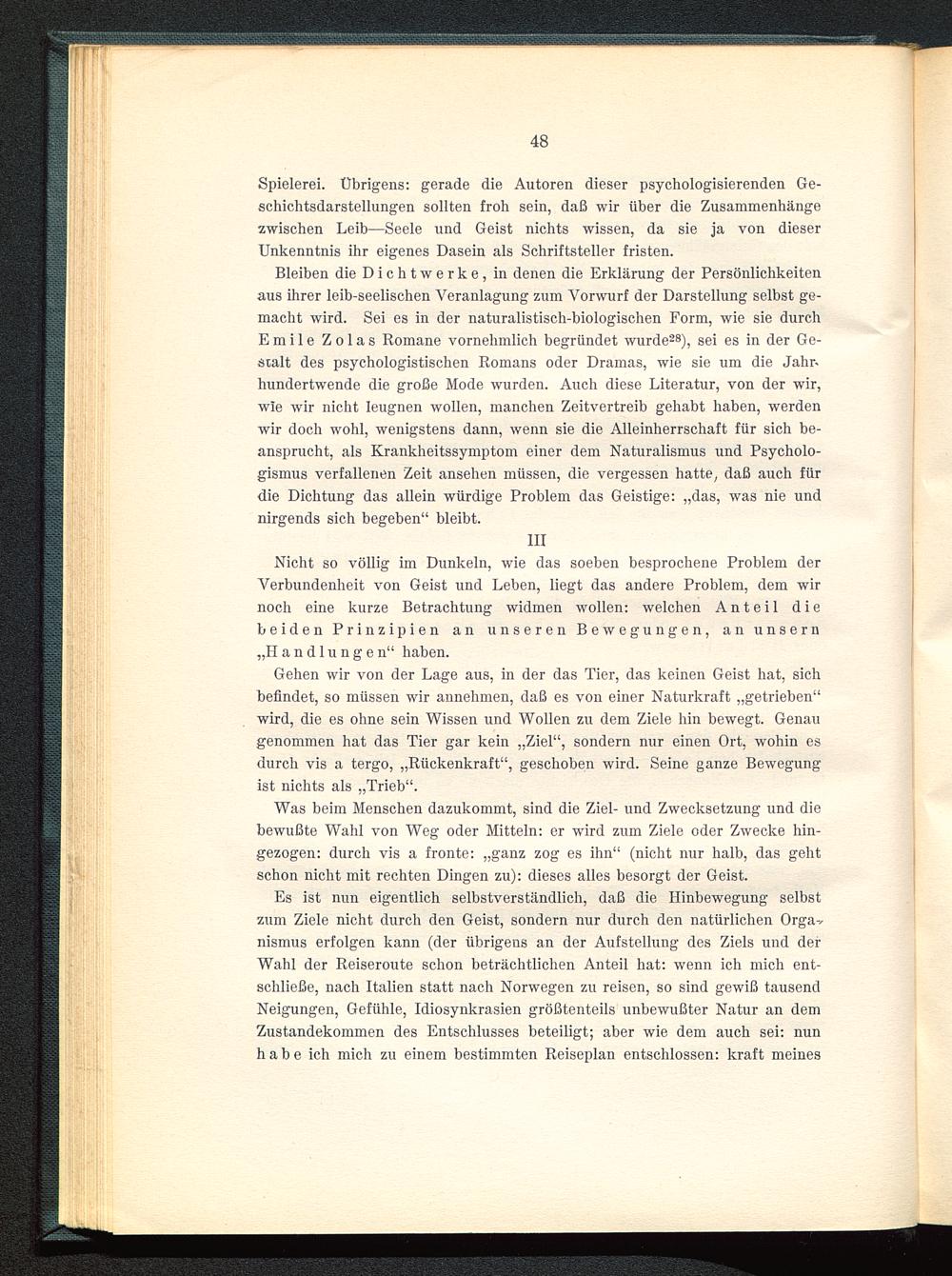 Bleiben die Dichtwerke, in denen die Erklärung der Persönlichkeitenaus ihrer leib-seelischen Veranlagung zum Vorwurf der Darstellung selbst ge-macht wird. Sei es in der naturalistisch-biologischen Form, wie sie durchEmile Zolas Romane vornehmlich begründet wurde 28 ), sei es in der Ge-stalt des psychologistischen Romans oder Dramas, wie sie um die Jahr-hundertwende die große Mode wurden. Auch diese Literatur, von der wir,wie wir nicht leugnen wollen, manchen Zeitvertreib gehabt haben, werdenwir doch wohl, wenigstens dann, wenn sie die Alleinherrschaft für sich be-ansprucht, als Krankheitssymptom einer dem Naturalismus und Psycholo-gismus verfallenen Zeit ansehen müssen, die vergessen hatte, daß auch fürdie Dichtung das allein würdige Problem das Geistige: „das, was nie undnirgends sich begeben“ bleibt.