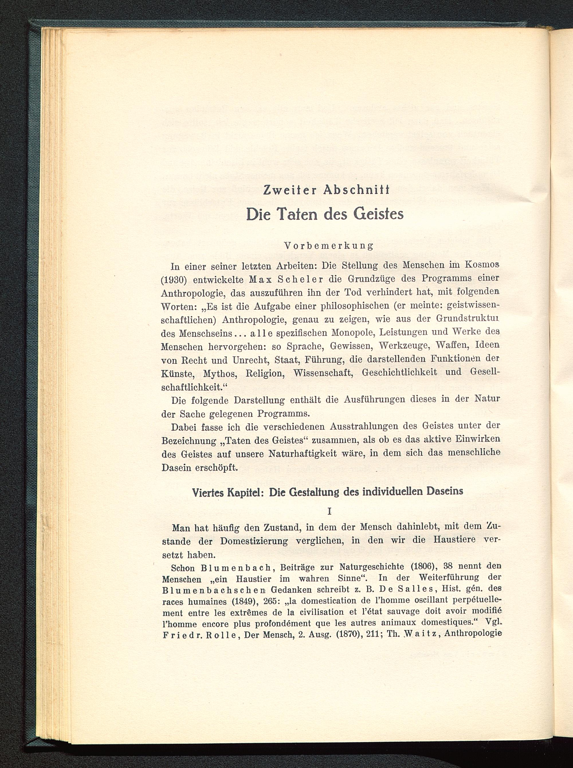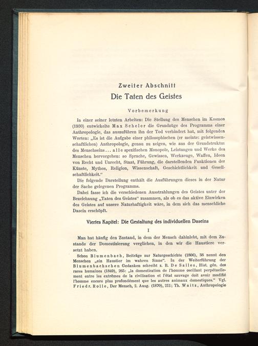 In einer seiner letzten Arbeiten: Die Stellung des Menschen im Kosmos(1930) entwickelte Max Scheler die Grundzüge des Programms einerAnthropologie, das auszuführen ihn der Tod verhindert hat, mit folgendenWorten: „Es ist die Aufgabe einer philosophischen (er meinte: geistwissen-schaftlichen) Anthropologie, genau zu zeigen, wie aus der Grundstruktuides Menschseins... alle spezifischen Monopole, Leistungen und Werke desMenschen hervorgehen: so Sprache, Gewissen, Werkzeuge, Waffen, Ideenvon Recht und Unrecht, Staat, Führung, die darstellenden Funktionen derKünste, Mythos, Religion, Wissenschaft, Geschichtlichkeit und Gesell-schaftlichkeit.“