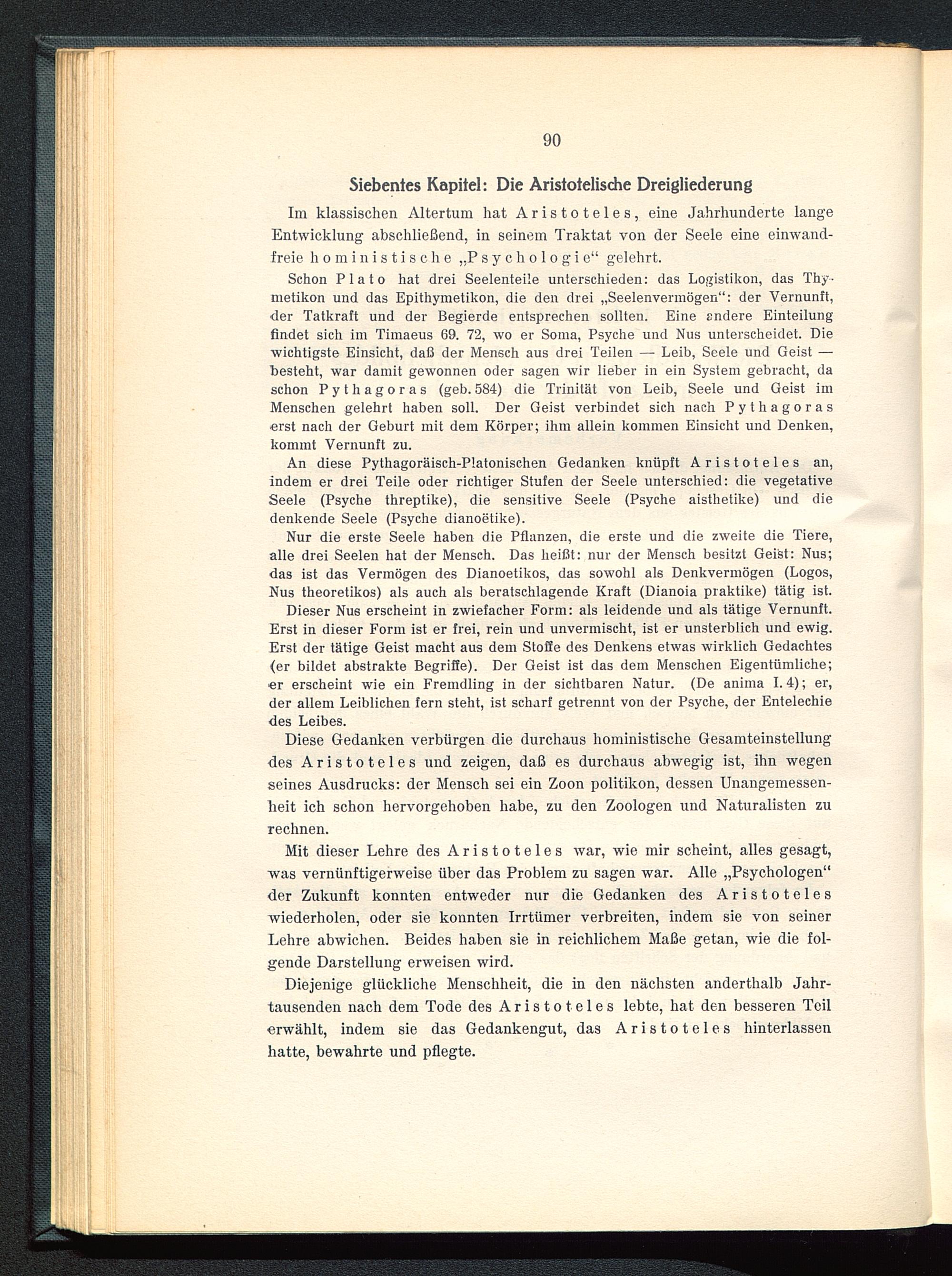 Schon Plato hat drei Seelenteile unterschieden: das Logistikon, das Thy -metikon und das Epithymetikon, die den drei „Seelenvennögen“: der Vernunft,der Tatkraft und der Begierde entsprechen sollten. Eine andere Einteilungfindet sich im Timaeus 69. 72, wo er Soma, Psyche und Nus unterscheidet. Diewichtigste Einsicht, daß der Mensch aus drei Teilen — Leib, Seele und Geist —besteht, war damit gewonnen oder sagen wir lieber in ein System gebracht, daschon Pythagoras (geb. 584) die Trinität von Leib, Seele und Geist imMenschen gelehrt haben soll. Der Geist verbindet sich nach Pythagoras erst nach der Geburt mit dem Körper; ihm allein kommen Einsicht und Denken,kommt Vernunft zu.