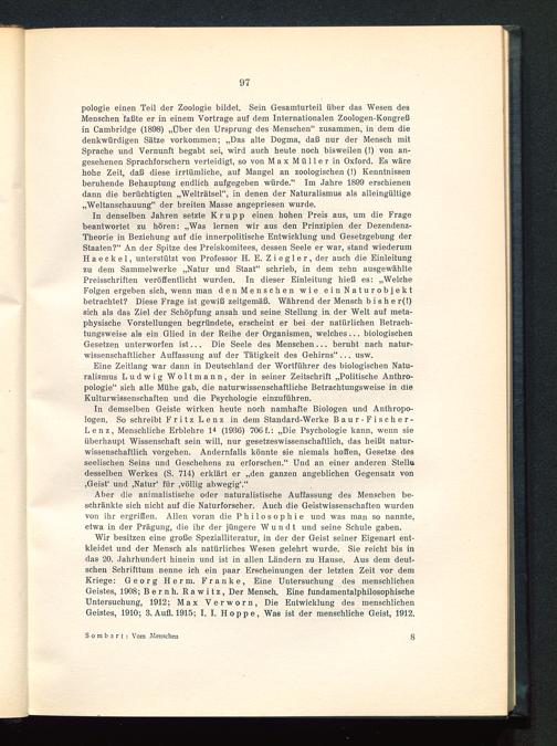 Wir besitzen eine große Spezialliteratur, in der der Geist seiner Eigenart ent-kleidet und der Mensch als natürliches Wesen gelehrt wurde. Sie reicht bis indas 20. Jahrhundert hinein und ist in allen Ländern zu Hause. Aus dem deut-schen Schrifttum nenne ich ein paar Erscheinungen der letzten Zeit vor demKriege: Georg Herrn. Franke, Eine Untersuchung des menschlichenGeistes, 1908; Bernh. Rawitz, Der Mensch. Eine fundamentalphilosophischeUntersuchung, 1912; Max Verworn , Die Entwicklung des menschlichenGeistes, 1910; 3. Aufl. 1915; I. I. Hoppe, Was ist der menschliche Geist, 1912.