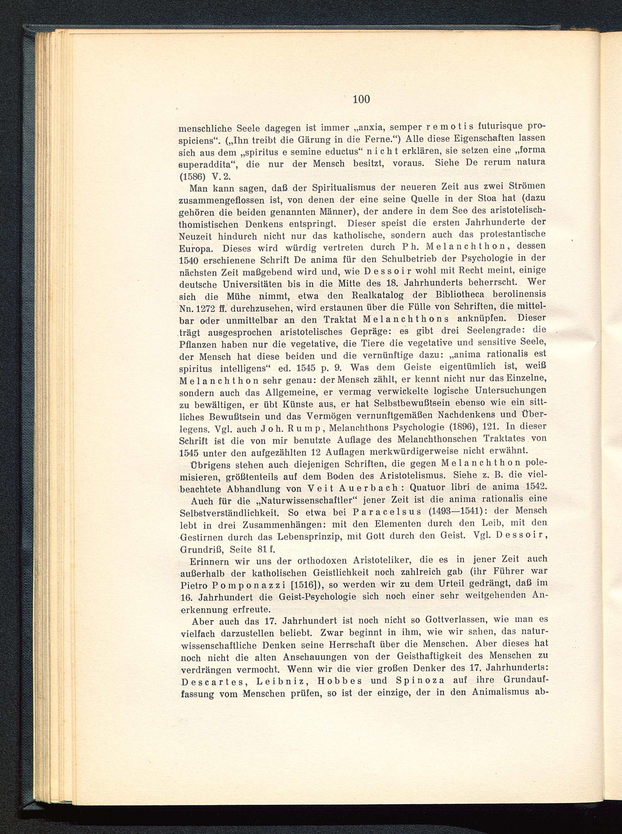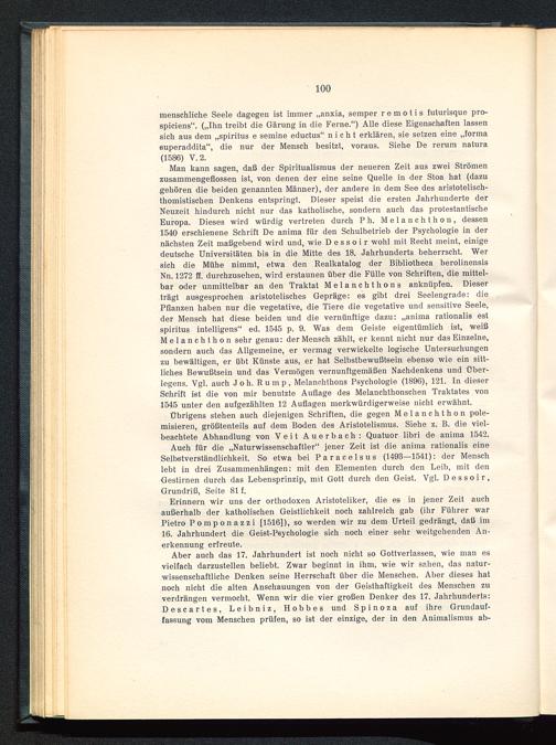 Man kann sagen, daß der Spiritualismus der neueren Zeit aus zwei Strömenzusammengeflossen ist, von denen der eine seine Quelle in der Stoa hat (dazugehören die beiden genannten Männer), der andere in dem See des aristotelisch-thomistischen Denkens entspringt. Dieser speist die ersten Jahrhunderte derNeuzeit hindurch nicht nur das katholische, sondern auch das protestantischeEuropa. Dieses wird würdig vertreten durch Ph. Melanchthon, dessen1540 erschienene Schrift De anima für den Schulbetrieb der Psychologie in dernächsten Zeit maßgebend wird und, wie D e s s o i r wohl mit Recht meint, einigedeutsche Universitäten bis in die Mitte des 18. Jahrhunderts beherrscht. Wersich die Mühe nimmt, etwa den Realkatalog der Bibliotheca berolinensisNn. 1272 fl. durchzusehen, wird erstaunen über die Fülle von Schriften, die mittel-bar oder unmittelbar an den Traktat Melanchthons anknüpfen. Dieserträgt ausgesprochen aristotelisches Gepräge: es gibt drei Seelengrade: diePflanzen haben nur die vegetative, die Tiere die vegetative und sensitive Seele,der Mensch hat diese beiden und die vernünftige dazu: „anima rationalis estspiritus intelligens“ ed. 1545 p. 9. Was dem Geiste eigentümlich ist, weißMelanchthon sehr genau: der Mensch zählt, er kennt nicht nur das Einzelne,sondern auch das Allgemeine, er vermag verwickelte logische Untersuchungenzu bewältigen, er übt Künste aus, er hat Selbstbewußtsein ebenso wie ein sitt-liches Bewußtsein und das Vermögen vernunftgemäßen Nachdenkens und Über-legens. Vgl. auch J o h. Rump, Melanchthons Psychologie (1896), 121. In dieserSchrift ist die von mir benutzte Auflage des Melanchthonschen Traktates von1545 unter den aufgezählten 12 Auflagen merkwürdigerweise nicht erwähnt.